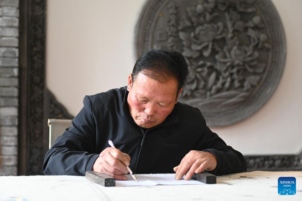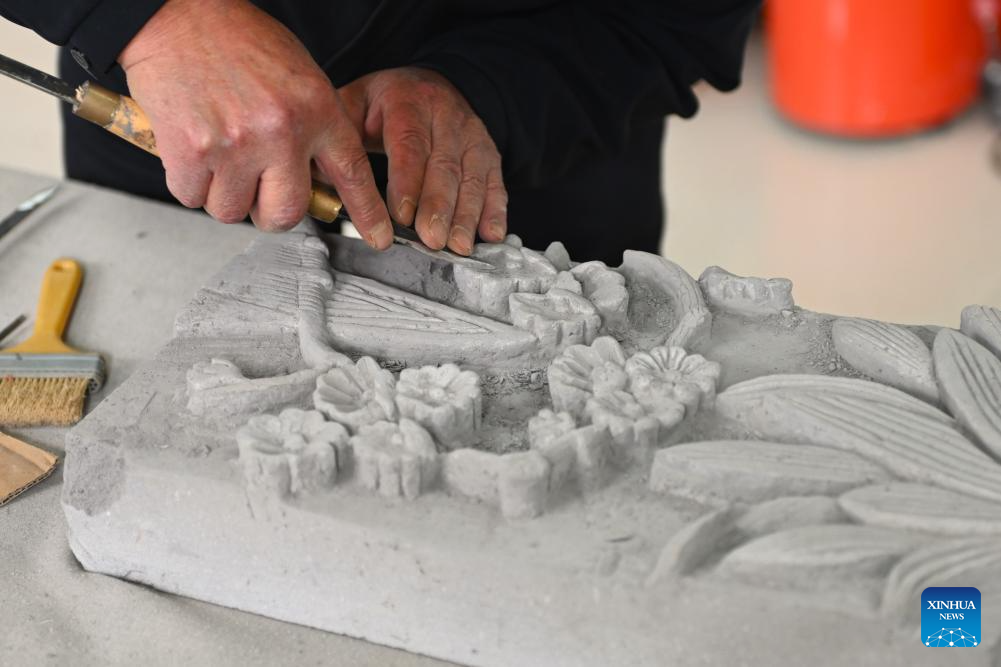 Bu Wenjun creates a carving pattern at a workshop of Wei's brick carving in Longde County of Guyuan, northwest China's Ningxia Hui Autonomous Region, Oct. 30, 2024. Bu Wenjun is the representative inheritor and the fourth generation descendant of Wei's brick carving technique, a national intangible cultural heritage with a history of more than 120 years. In recent years, Wei's brick carving inheritance base has carried out training and teaching activities, which not only carried forward the traditional craft, but also helped local villagers increase income. (Xinhua/Mao Zhu)