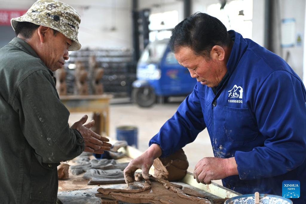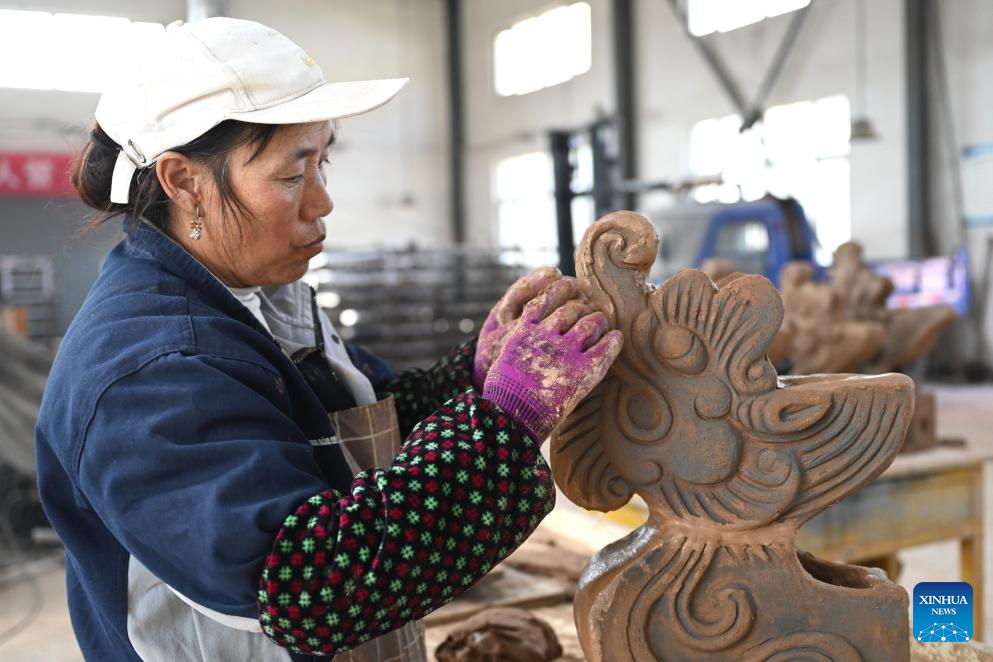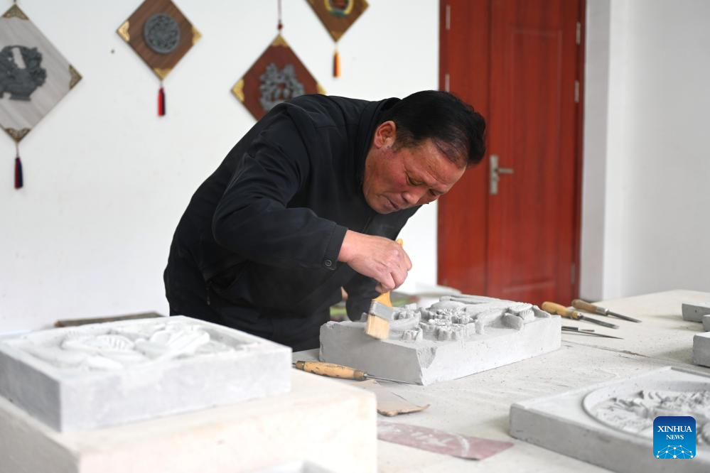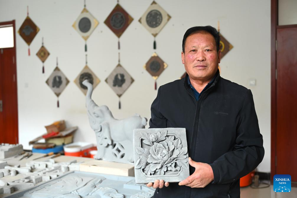 A staff member works at a workshop of Wei's brick carving in Longde County of Guyuan, northwest China's Ningxia Hui Autonomous Region, Oct. 30, 2024. Bu Wenjun is the representative inheritor and the fourth generation descendant of Wei's brick carving technique, a national intangible cultural heritage with a history of more than 120 years. In recent years, Wei's brick carving inheritance base has carried out training and teaching activities, which not only carried forward the traditional craft, but also helped local villagers increase income. (Xinhua/Mao Zhu)