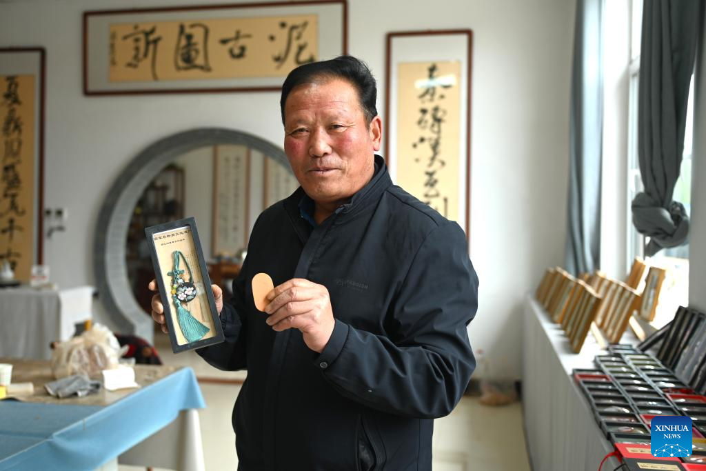 Bu Wenjun shows a creative cultural product at a workshop of Wei's brick carving in Longde County of Guyuan, northwest China's Ningxia Hui Autonomous Region, Oct. 30, 2024. Bu Wenjun is the representative inheritor and the fourth generation descendant of Wei's brick carving technique, a national intangible cultural heritage with a history of more than 120 years. In recent years, Wei's brick carving inheritance base has carried out training and teaching activities, which not only carried forward the traditional craft, but also helped local villagers increase income. (Xinhua/Mao Zhu)