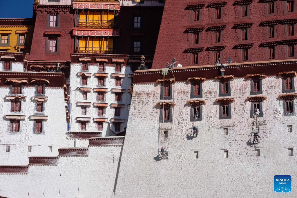 Workers paint the wall of the Potala Palace during an annual renovation of the ancient architectural complex in Lhasa, southwest China's Xizang Autonomous Region, Oct. 30, 2024. (Xinhua/Tenzing Nima Qadhup)