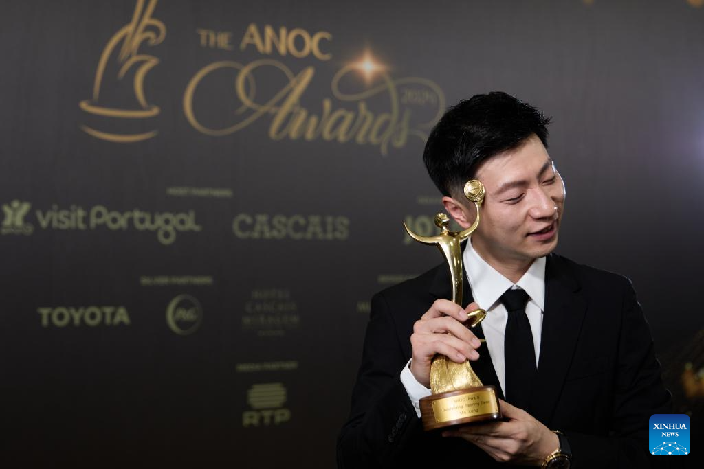 Chinese table tennis icon Ma Long reacts after receiving the ANOC award for Outstanding Sporting Career Award during the awarding ceremony of the Association of National Olympic Committees (ANOC) Awards 2024 in Cascais, Portugal, on Oct. 30, 2024. (Xinhua/Meng Dingbo)