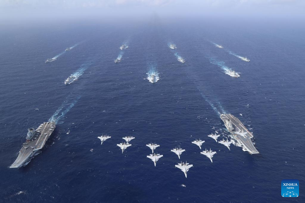 The formations of Chinese aircraft carriers Liaoning and Shandong carry out a dual aircraft carrier formation exercise for the first time in the South China Sea in late October 2024. The exercise was part of the Liaoning aircraft carrier formation's regular real-combat training in the high seas, which concluded recently. (Photo by Chen Mengxi/Xinhua)