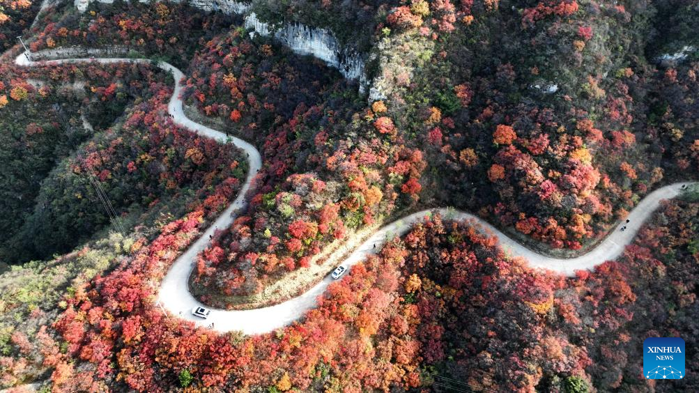 An aerial drone photo taken on Oct. 30, 2024 shows the autumn scenery of Jiguan Mountain scenic area in Shahe City, north China's Hebei Province. The Jiguan Mountain has entered its peak viewing season, drawing tourists to explore its beauty. (Xinhua/Mu Yu)