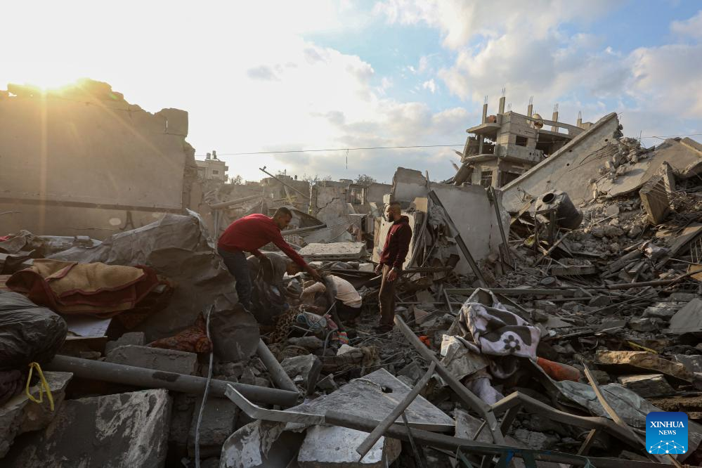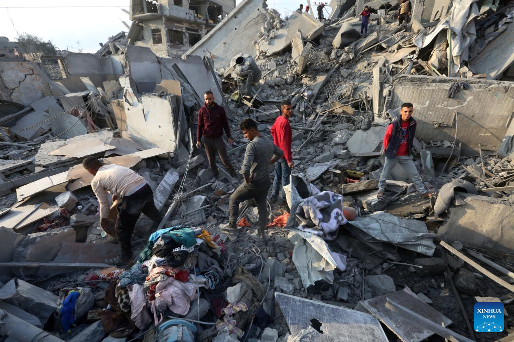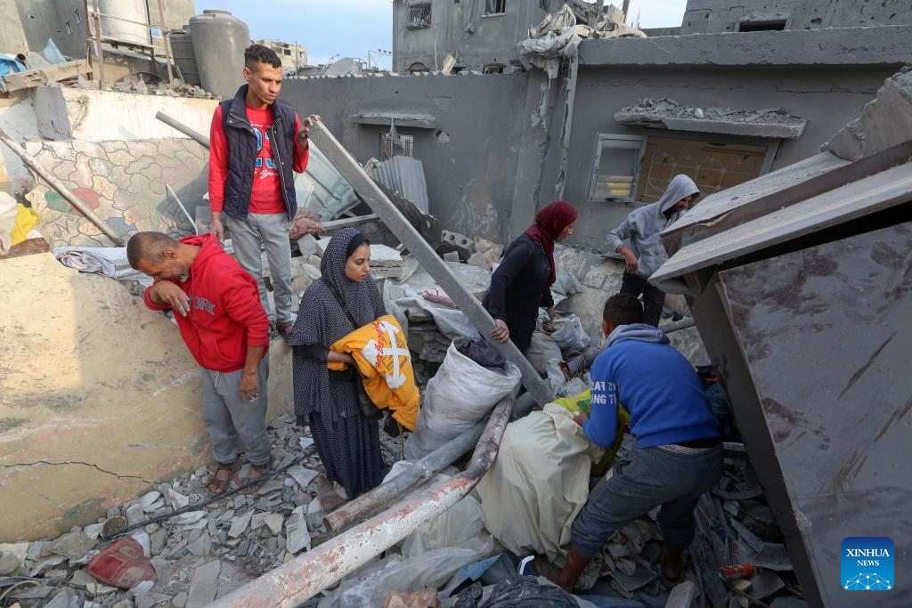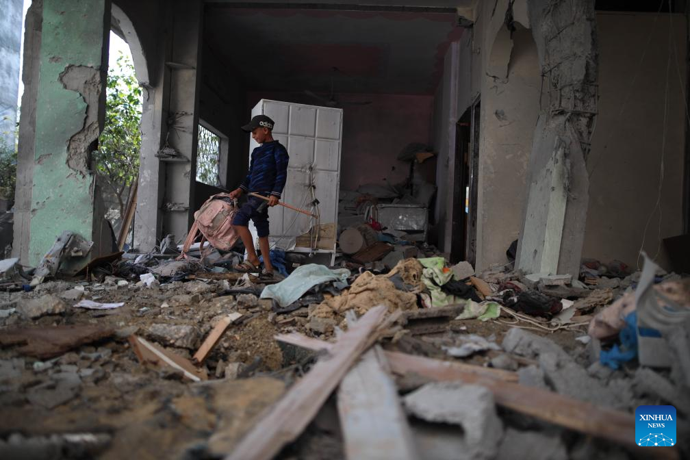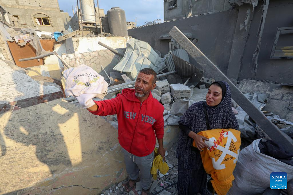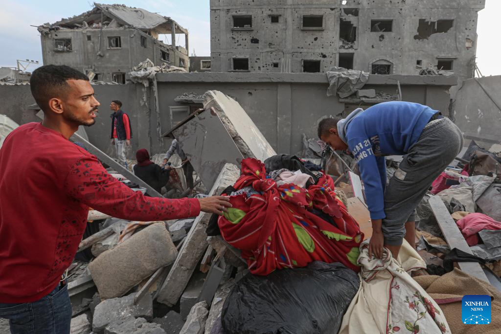 People collect items from the rubble of a building destroyed in an Israeli attack in the Nuseirat refugee camp, central Gaza Strip, on Nov. 1, 2024. At least 30 people were killed in Israeli air and artillery strikes across the Gaza Strip on Friday, according to Palestinian sources. Palestinian security sources told Xinhua that the Israeli army has intensified its attacks on different areas across the Strip, particularly the Nuseirat refugee camp in central Gaza. (Photo by Rizek Abdeljawad/Xinhua)