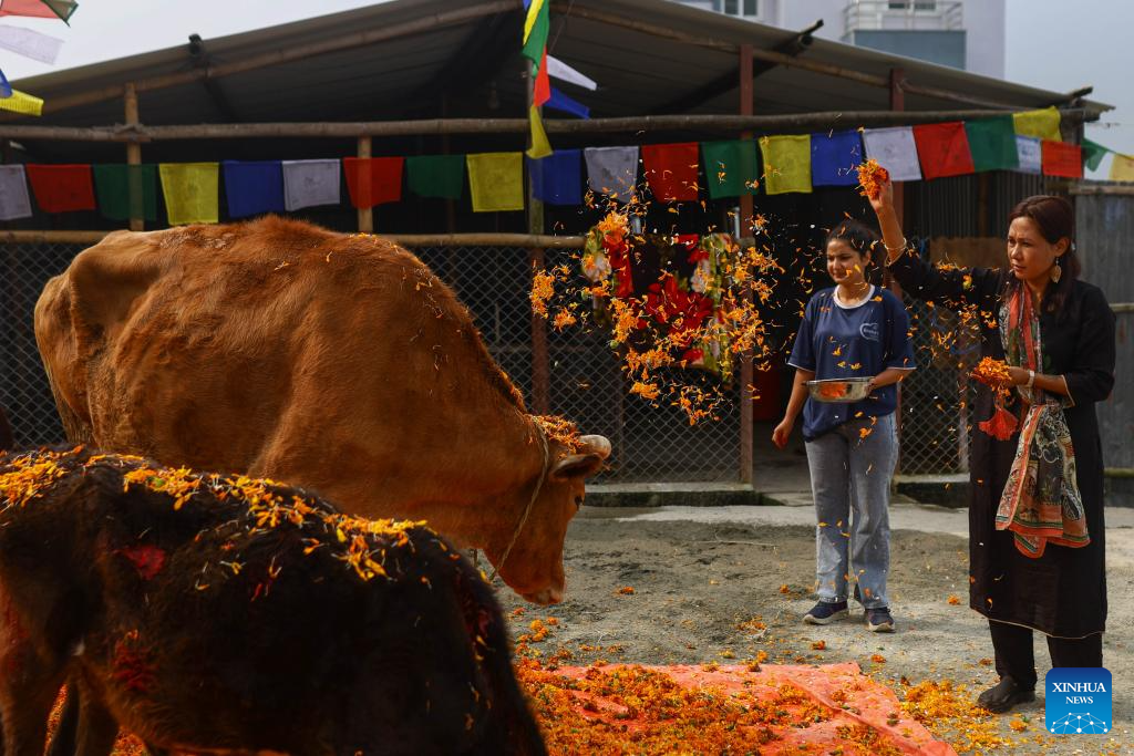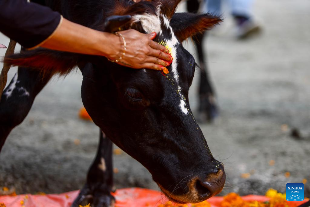 Cows are worshiped during Tihar, also known as the festival of lights, in Lalitpur, Nepal, Nov. 2, 2024. (Photo by Sulav Shrestha/Xinhua)
