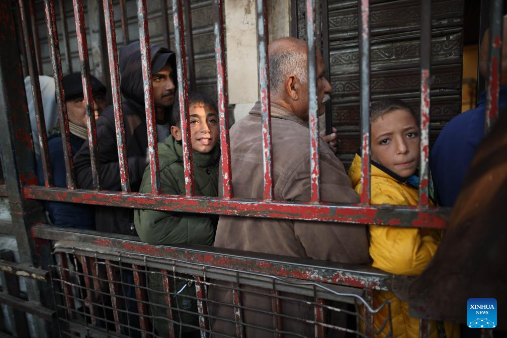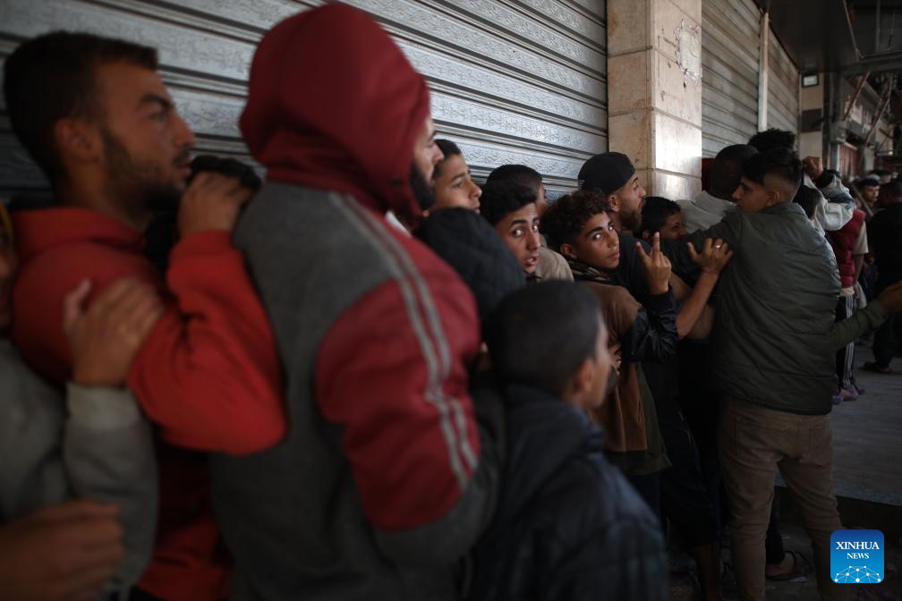 Palestinians wait in a queue to buy bread from an operating bakery in the al-Nuseirat refugee camp, central Gaza Strip, on Nov. 1, 2024. (Photo by Marwan Dawood/Xinhua)