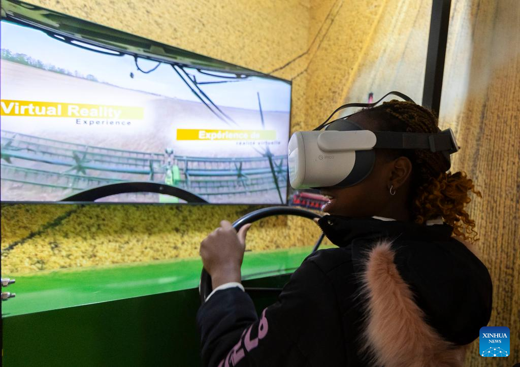 A girl experiences a virtual 360-degree grain farming ride at the 2024 Royal Agricultural Winter Fair in Toronto, Canada, on Nov. 1, 2024. Showcasing the best in agriculture, local food and more, the annual ten-day fair kicked off here on Friday. (Photo by Zou Zheng/Xinhua)