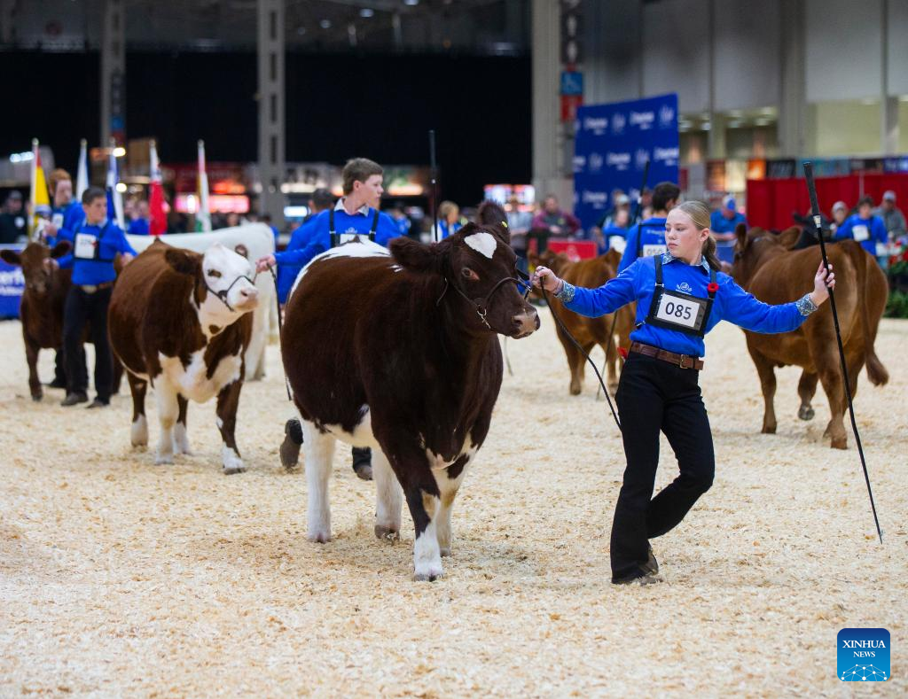 Breeders lead cows during a junior beef heifer show at the 2024 Royal Agricultural Winter Fair in Toronto, Canada, on Nov. 1, 2024. Showcasing the best in agriculture, local food and more, the annual ten-day fair kicked off here on Friday. (Photo by Zou Zheng/Xinhua)