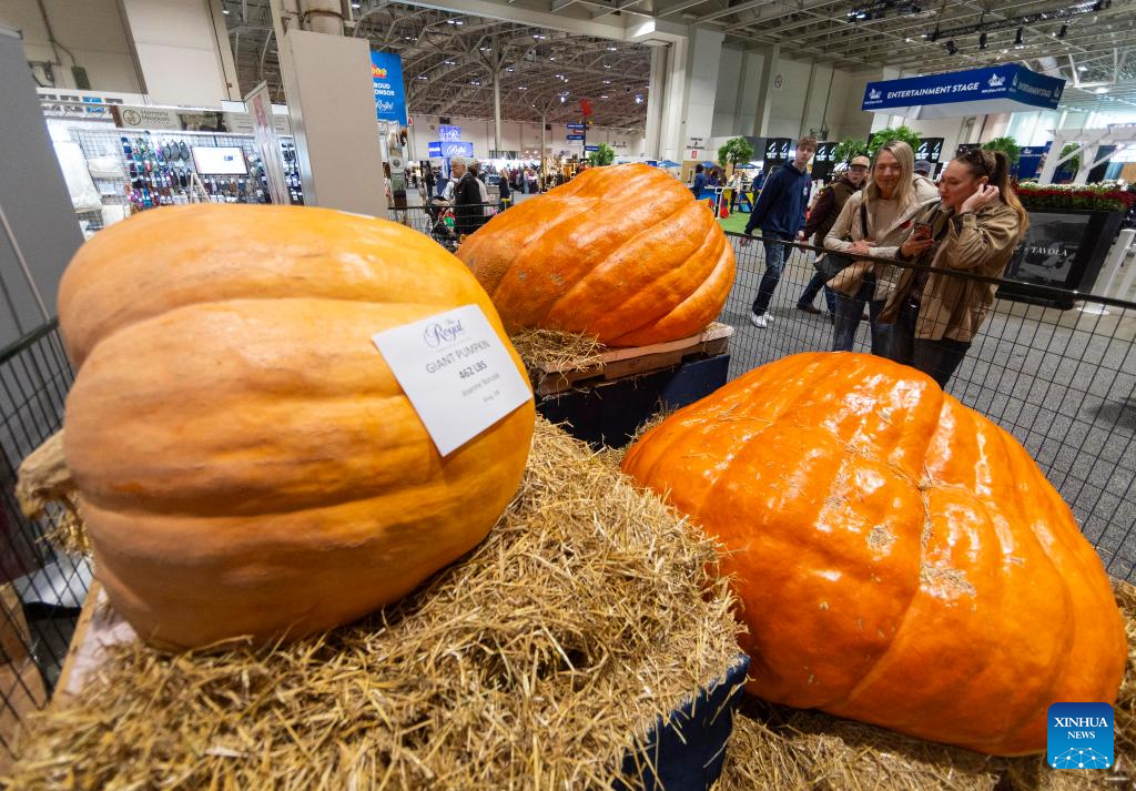 Visitors look at giant pumpkins at the 2024 Royal Agricultural Winter Fair in Toronto, Canada, on Nov. 1, 2024. Showcasing the best in agriculture, local food and more, the annual ten-day fair kicked off here on Friday. (Photo by Zou Zheng/Xinhua)