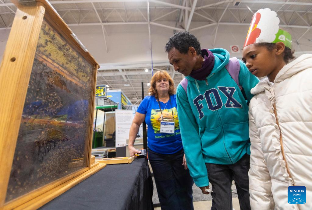 Visitors look at honeybees at the 2024 Royal Agricultural Winter Fair in Toronto, Canada, on Nov. 1, 2024. Showcasing the best in agriculture, local food and more, the annual ten-day fair kicked off here on Friday. (Photo by Zou Zheng/Xinhua)
