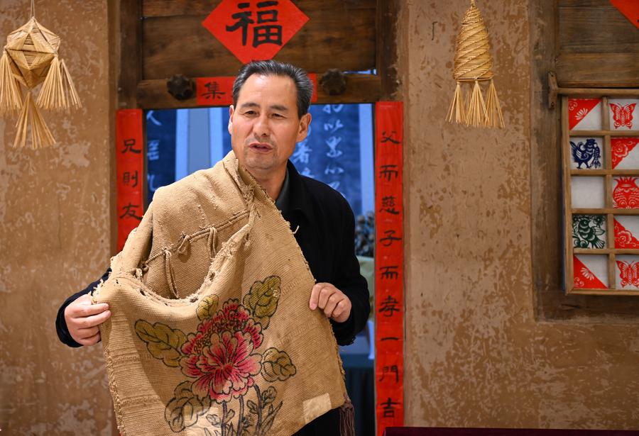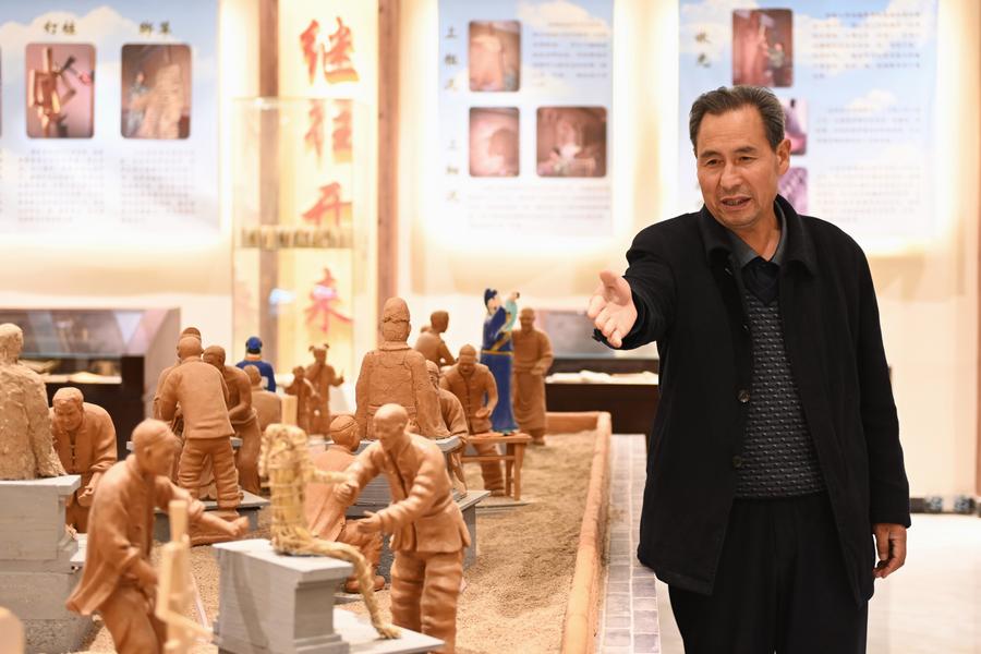 Yang Jianian shows a painted sculpture at a gallery of Yang's painted sculpture in Longde County, northwest China's Ningxia Hui Autonomous Region, on Oct. 31, 2024. (Xinhua/Mao Zhu)
