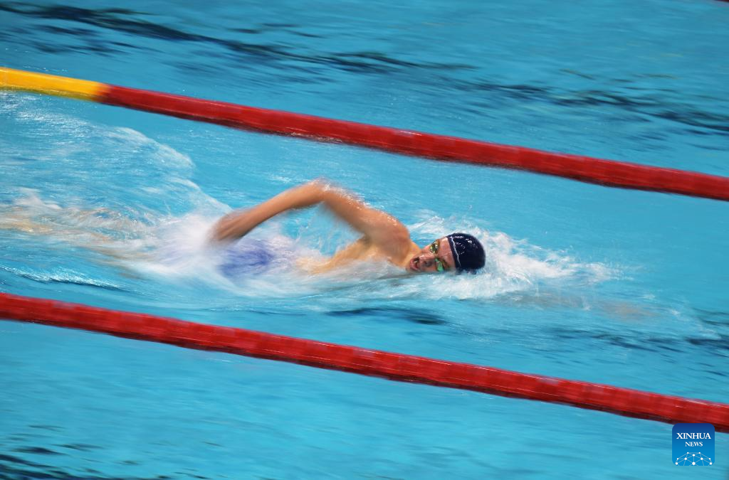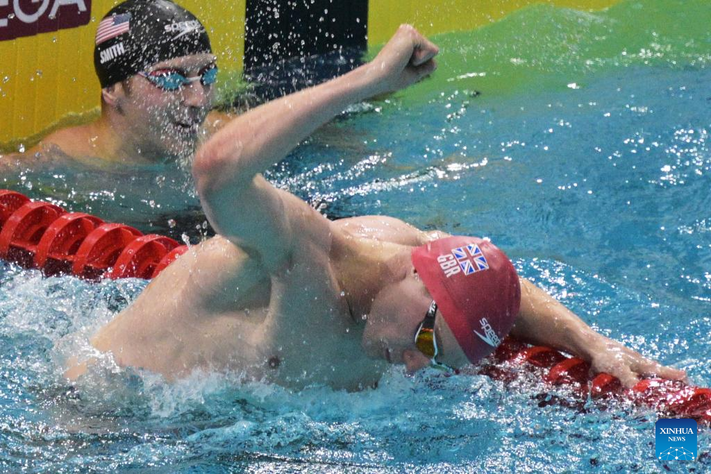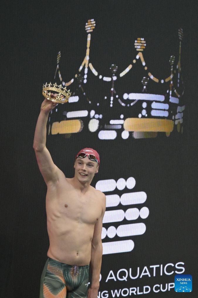 Duncan Scott of Britain celebrates after the men's 200m freestyle final at the World Aquatics Swimming World Cup in Singapore on Nov. 2, 2024. (Photo by Then Chih Wey/Xinhua)