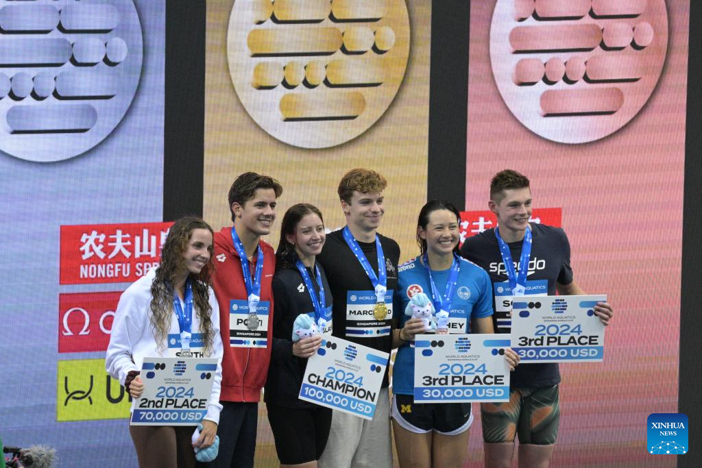 Gold medalists Kate Douglass (3rd L) of the United States and Leon Marchand (3rd R) of France pose with silver medalists Regan Smith (1st L) of the United States and Noe Ponti (2nd L) of Switzerland and bronze medalists Siobhan Bernadette Haughey of China's Hong Kong and Duncan Scott (1st R) of Britain after winning the overall championship of the World Aquatics Swimming World Cup in Singapore, Nov. 2, 2024. (Photo by Then Chih Wey/Xinhua)