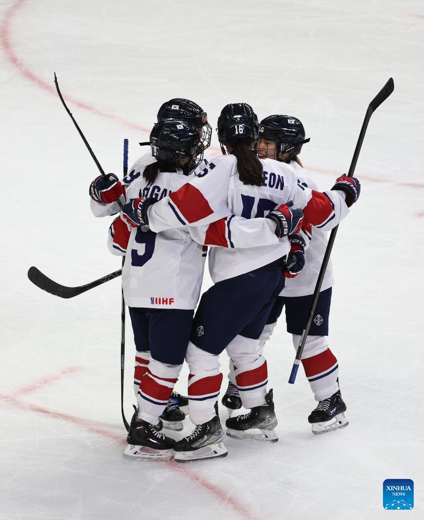 Players of South Korea celebrate scoring during the match between South Korea and Kazakhstan at 2025 IIHF Ice Hockey Women's Asia Championship in Beijing, capital of China, Nov. 3, 2024. (Xinhua/Wang Kaiyan)