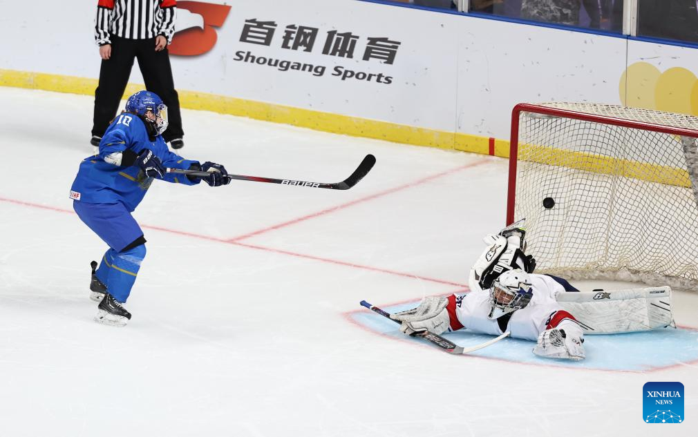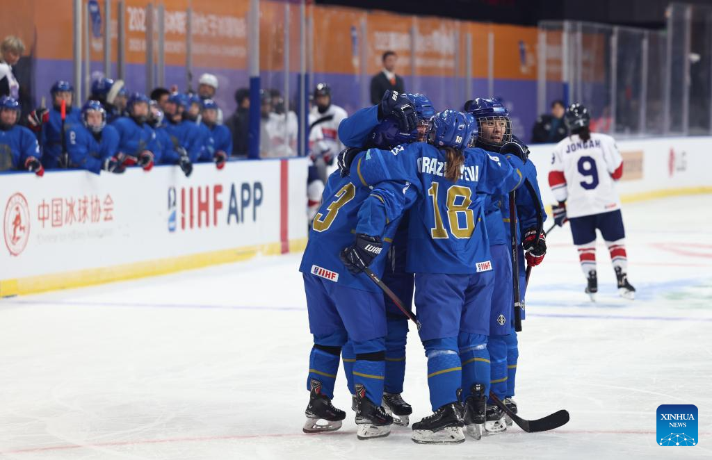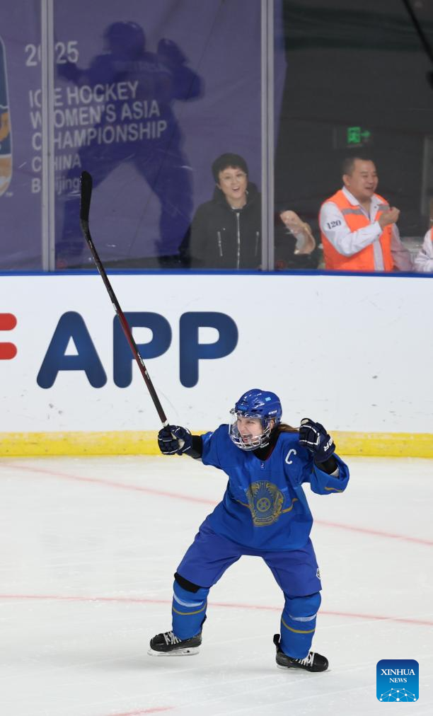 Players of Kazakhstan celebrate scoring during the match between South Korea and Kazakhstan at 2025 IIHF Ice Hockey Women's Asia Championship in Beijing, capital of China, Nov. 3, 2024. (Xinhua/Wang Kaiyan)