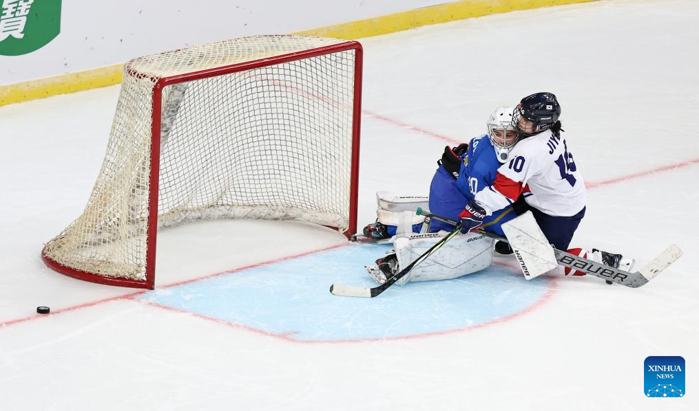 Kim Yeonju (R) of South Korea makes a save during the match between South Korea and Kazakhstan at 2025 IIHF Ice Hockey Women's Asia Championship in Beijing, capital of China, Nov. 3, 2024. (Xinhua/Wang Kaiyan)