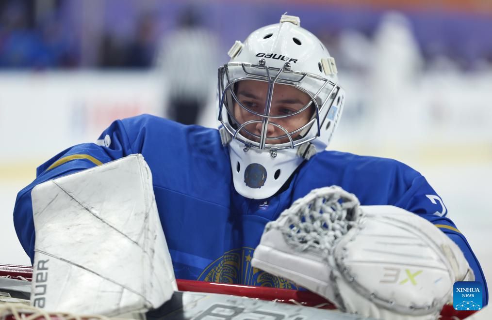 Arina Chshyokolova of Kazakhstan reacts before the match between South Korea and Kazakhstan at 2025 IIHF Ice Hockey Women's Asia Championship in Beijing, capital of China, Nov. 3, 2024. (Xinhua/Wang Kaiyan)
