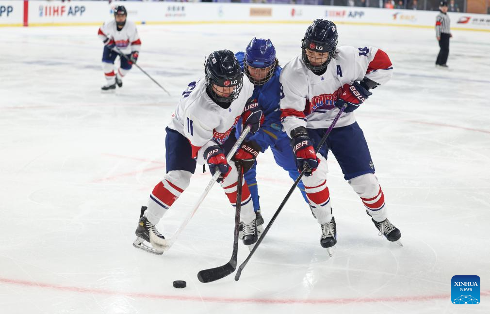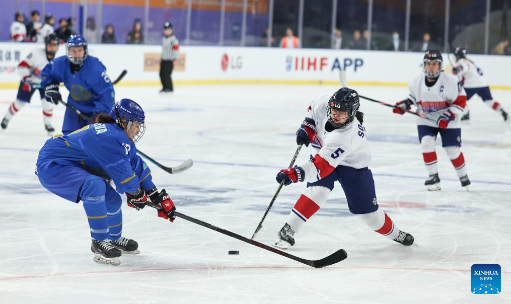 Lee Sojung (front R) of South Korea shoots during the match between South Korea and Kazakhstan at 2025 IIHF Ice Hockey Women's Asia Championship in Beijing, capital of China, Nov. 3, 2024. (Xinhua/Wang Kaiyan)