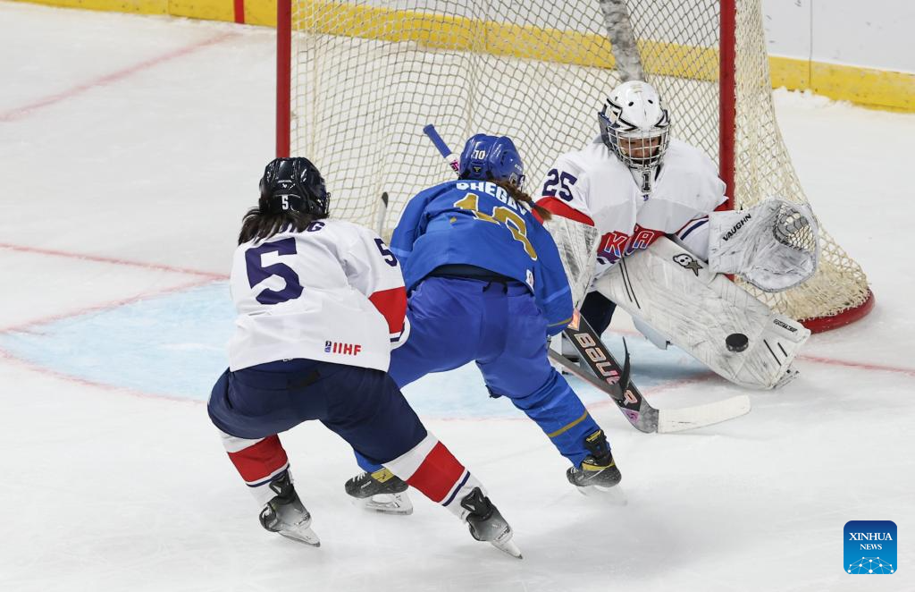 Madina Tursynova (C) of Kazakhstan competes during the match between South Korea and Kazakhstan at 2025 IIHF Ice Hockey Women's Asia Championship in Beijing, capital of China, Nov. 3, 2024. (Xinhua/Wang Kaiyan)