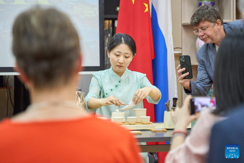 A woman performs tea ceremony during an event entitled Path of Friendship at the Gorky Public Library in Vladivostok, Russia, Nov. 2, 2024. The event promoting traditional Chinese culture was held here on Saturday, drawing over 100 participants, including Chinese culture enthusiasts, students, and local residents. (Photo by Guo Feizhou/Xinhua)