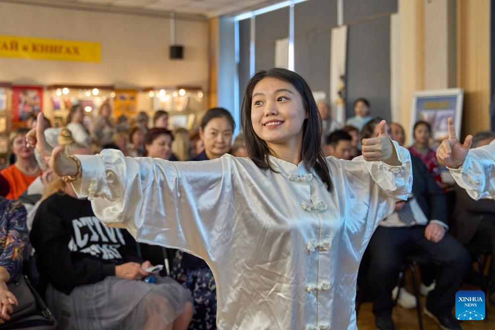 A performance of Baduanjin aerobic exercises is presented during an event entitled Path of Friendship at the Gorky Public Library in Vladivostok, Russia, Nov. 2, 2024. The event promoting traditional Chinese culture was held here on Saturday, drawing over 100 participants, including Chinese culture enthusiasts, students, and local residents. (Photo by Guo Feizhou/Xinhua)