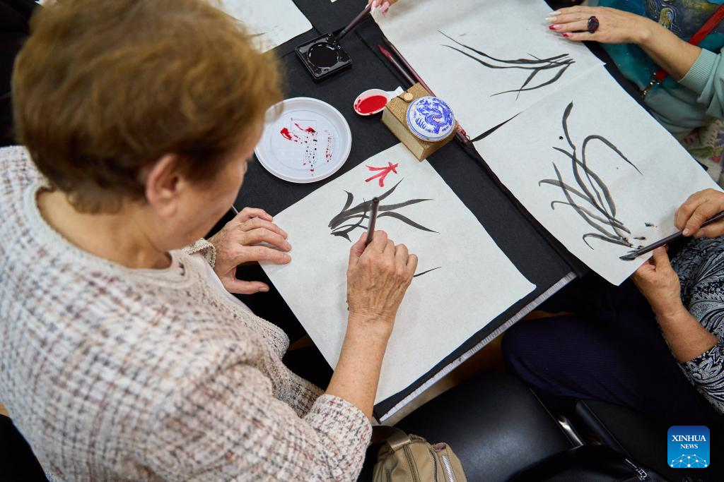 Guests write Chinese calligraphy during an event entitled Path of Friendship at the Gorky Public Library in Vladivostok, Russia, Nov. 2, 2024. The event promoting traditional Chinese culture was held here on Saturday, drawing over 100 participants, including Chinese culture enthusiasts, students, and local residents. (Photo by Guo Feizhou/Xinhua)