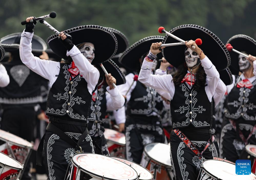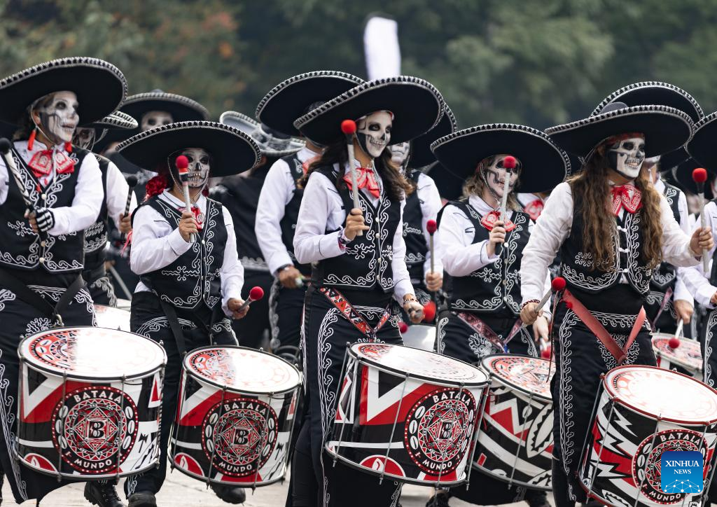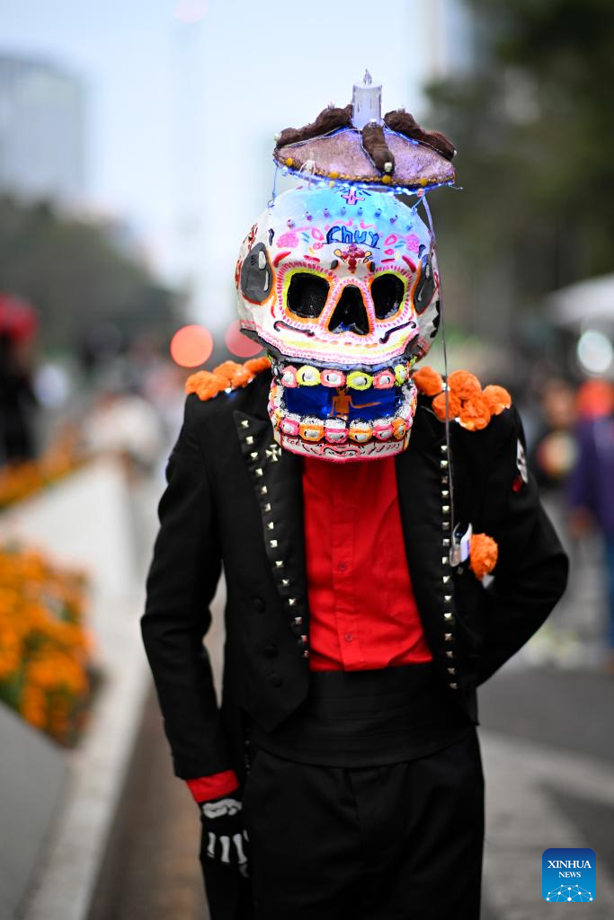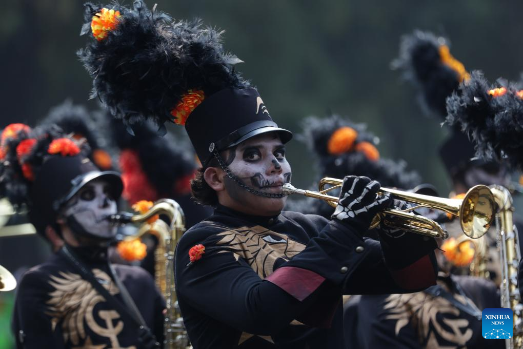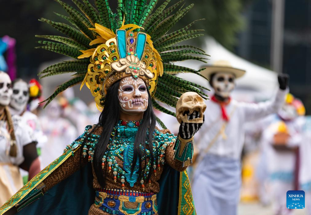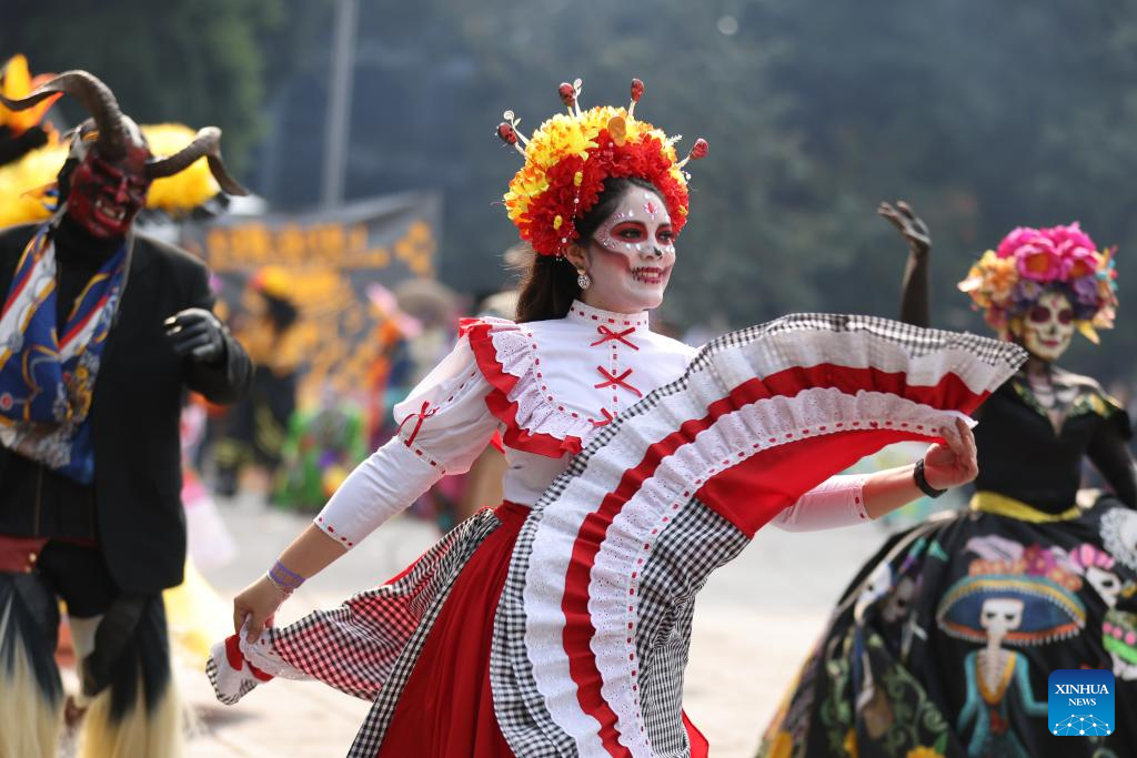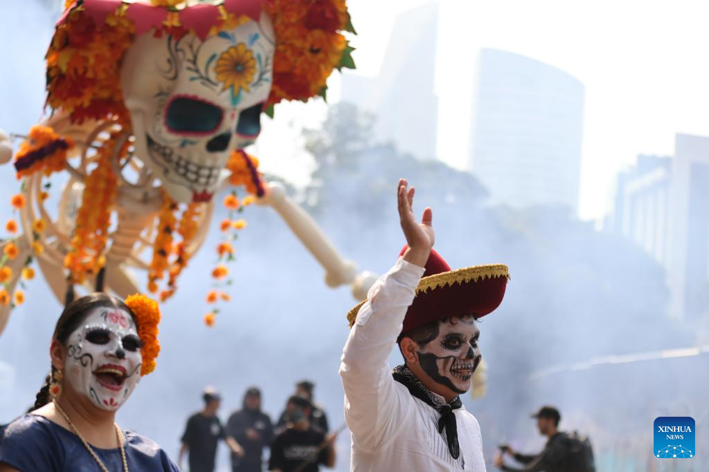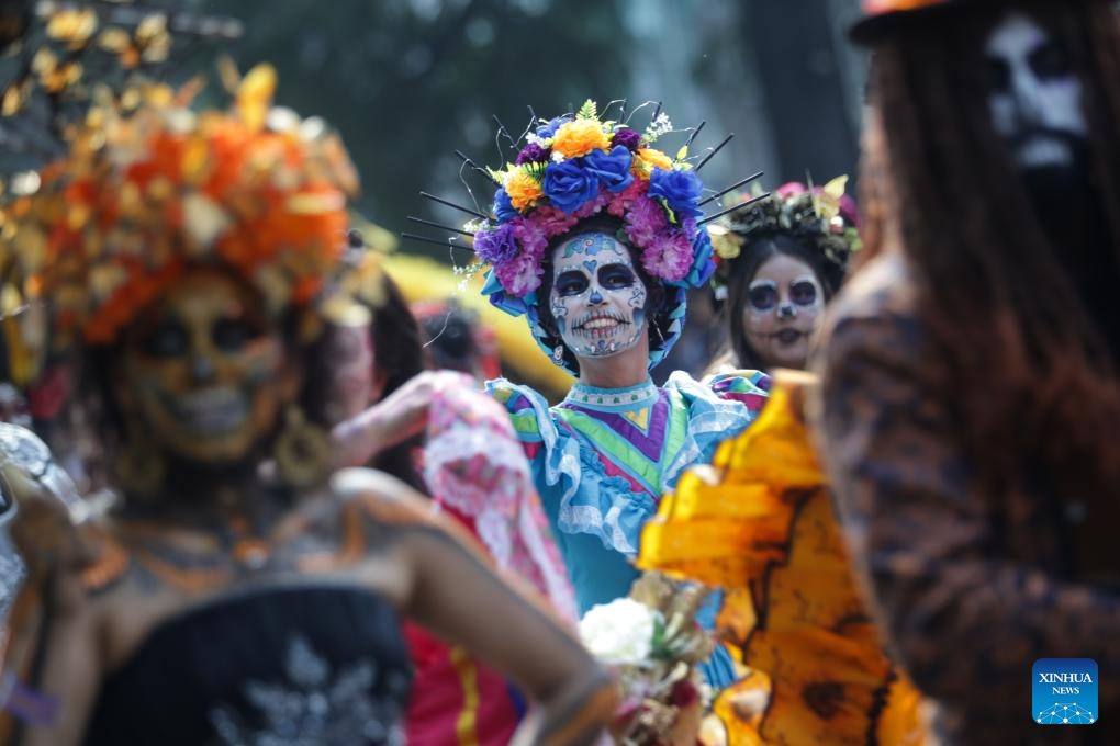 People in costumes and facial makeup participate in the Day of the Dead Parade in downtown Mexico City, capital of Mexico, on Nov. 2, 2024. (Xinhua/Li Mengxin)