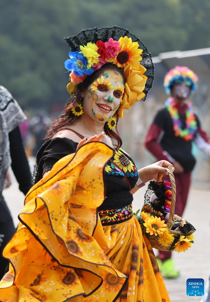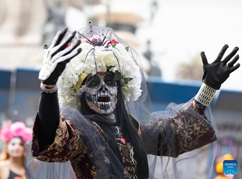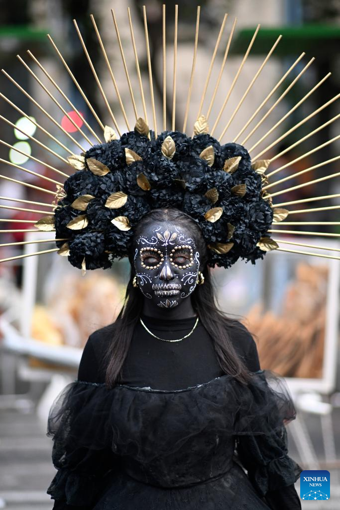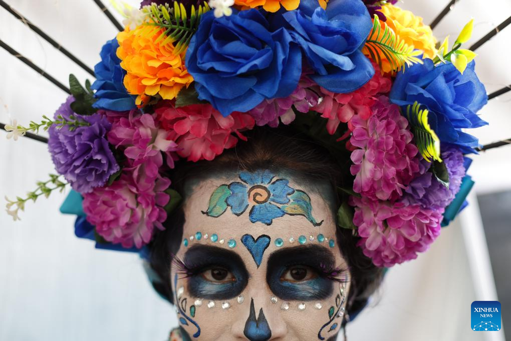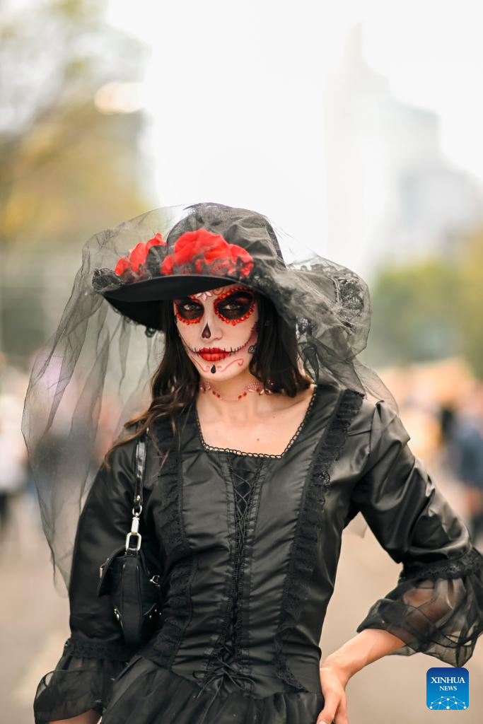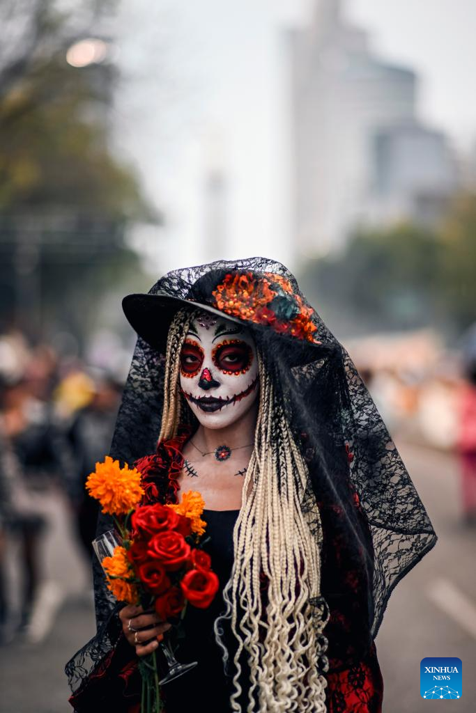 A dressed-up woman participates in the Day of the Dead Parade in downtown Mexico City, capital of Mexico, on Nov. 2, 2024. (Xinhua/Li Mengxin)