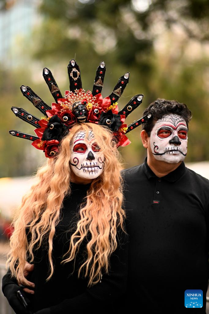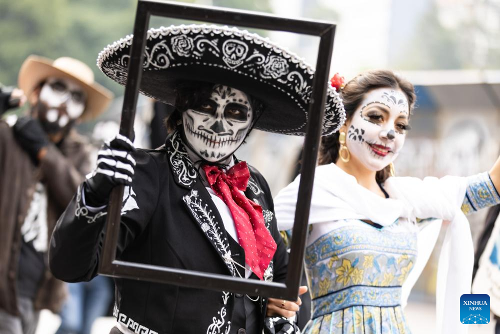 People dressed in the Day of the Dead costumes poses for picture in downtown Mexico City, Mexico, Nov. 2, 2024. Mexico's Day of the Dead (Día de Muertos) is a vibrant celebration where families honor and remember deceased loved ones. (Xinhua/Li Muzi)