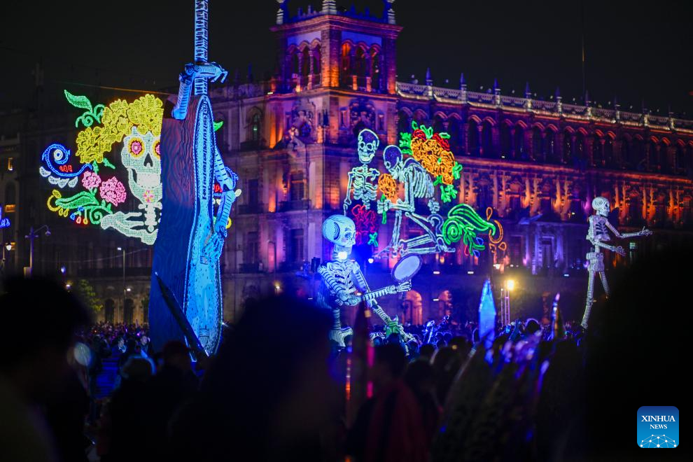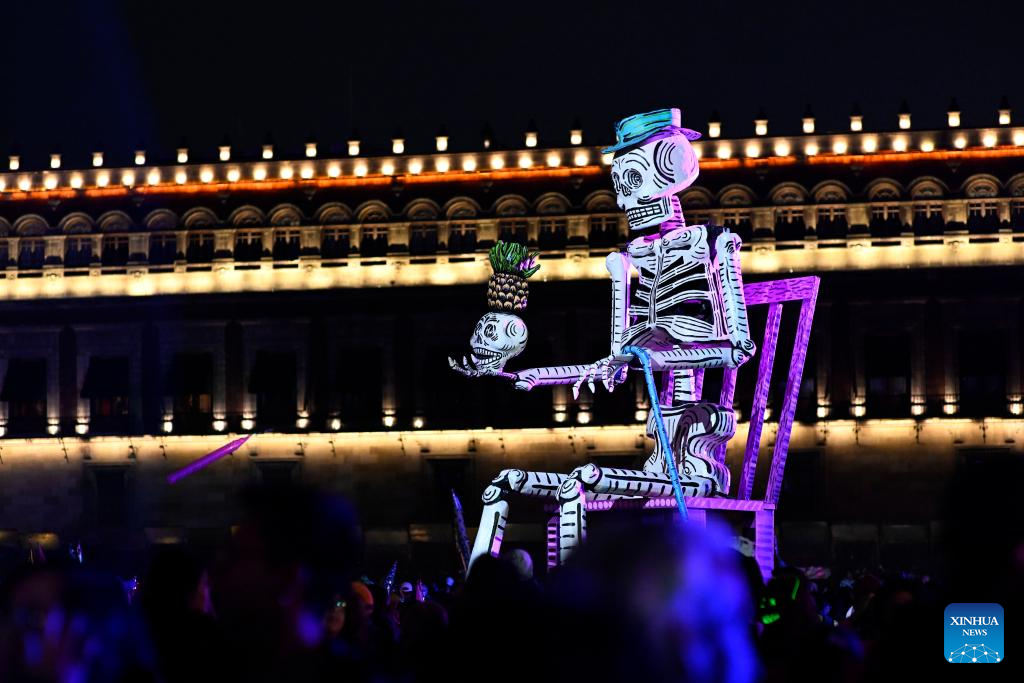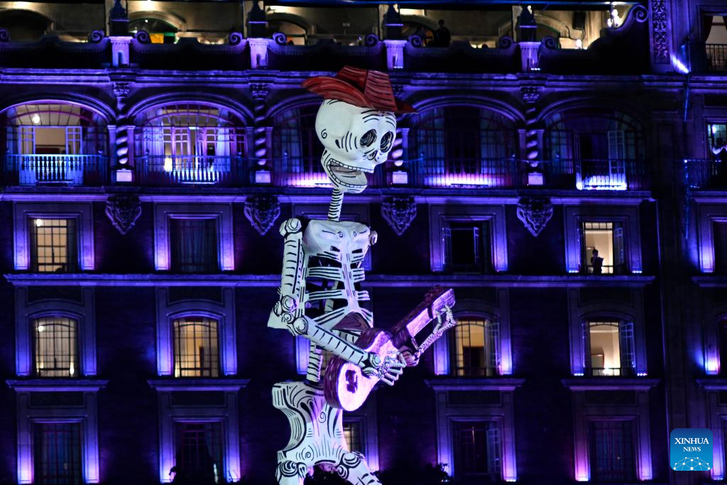 A giant skeleton sculpture is pictured at the Constitution Plaza as people celebrate the Day of the Dead in Mexico City, Mexico, Nov. 2, 2024. Mexico's Day of the Dead (Día de Muertos) is a vibrant celebration where families honor and remember deceased loved ones. (Xinhua/Li Muzi)
