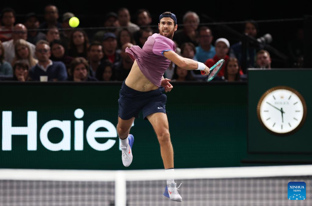Karen Khachanov of Russia hits a return during the singles semi-final match between Ugo Humbert of France and Karen Khachanov of Russia at Paris ATP Masters 1000 tennis tournament in Paris, France, Nov. 2, 2024. (Xinhua/Gao Jing)