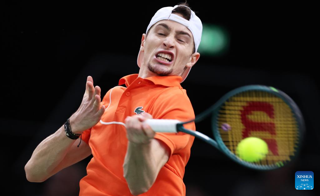 Ugo Humbert of France hits a return during the singles semi-final match between Ugo Humbert of France and Karen Khachanov of Russia at Paris ATP Masters 1000 tennis tournament in Paris, France, Nov. 2, 2024. (Xinhua/Gao Jing)