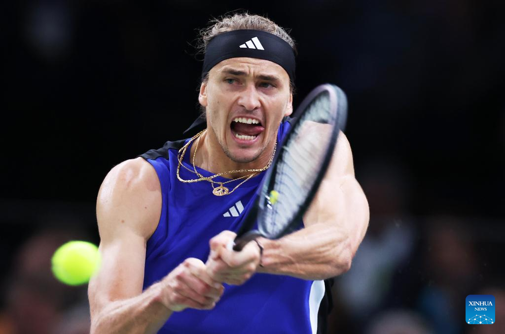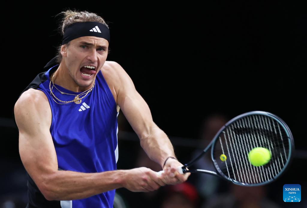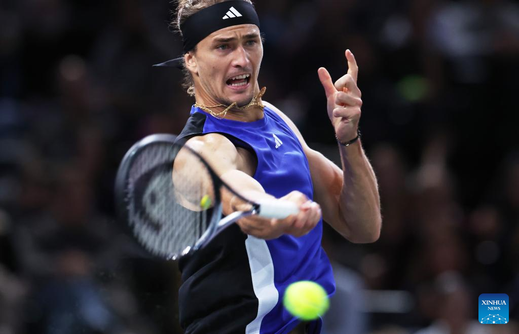 Alexander Zverev of Germany hits a return during the men's singles semi-final match between Alexander Zverev of Germany and Holger Rune of Denmark at Paris ATP Masters 1000 tennis tournament in Paris, France, Nov. 2, 2024. (Xinhua/Gao Jing)