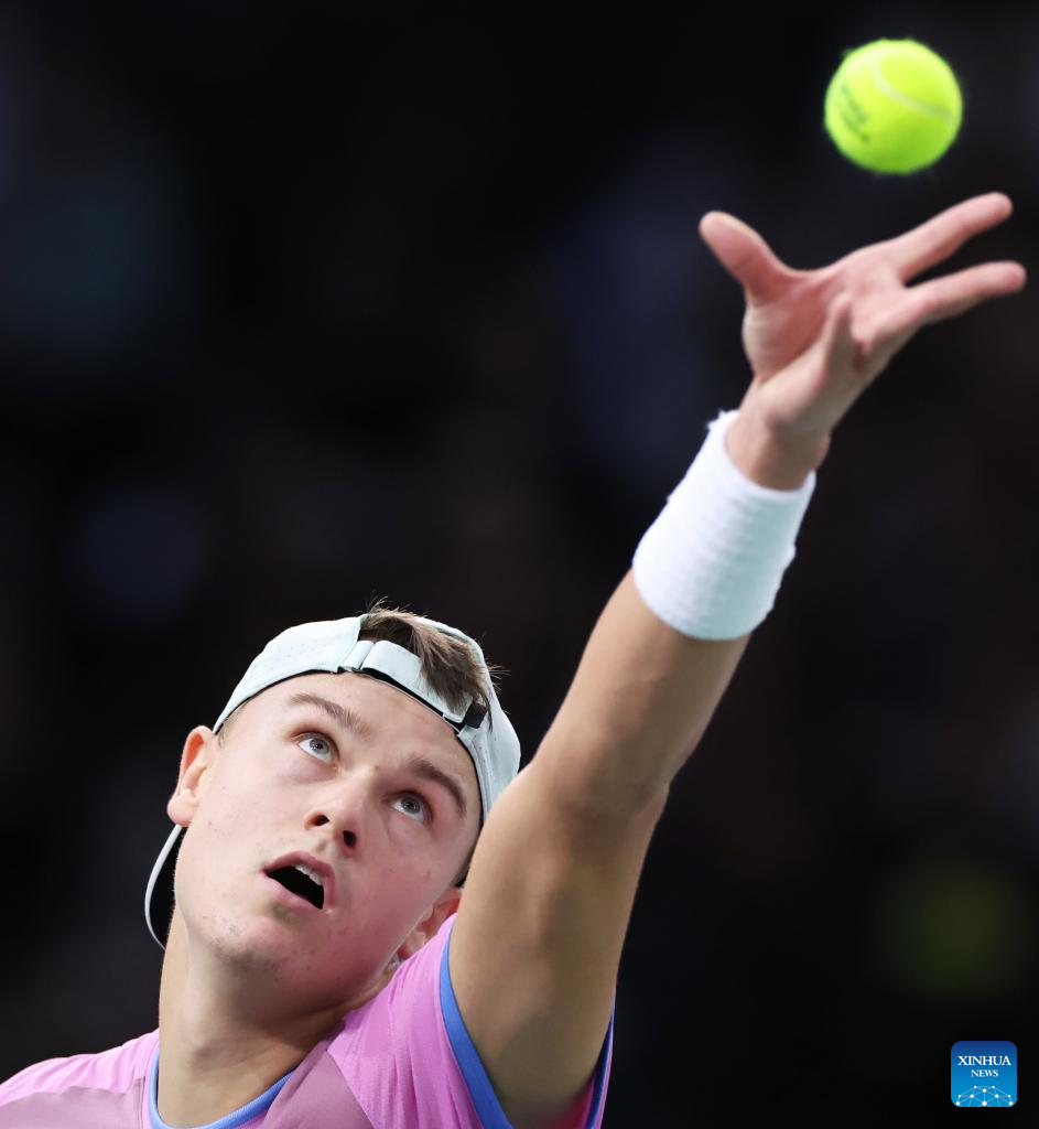 Holger Rune of Denmark serves during the men's singles semi-final match between Alexander Zverev of Germany and Holger Rune of Denmark at Paris ATP Masters 1000 tennis tournament in Paris, France, Nov. 2, 2024. (Xinhua/Gao Jing)