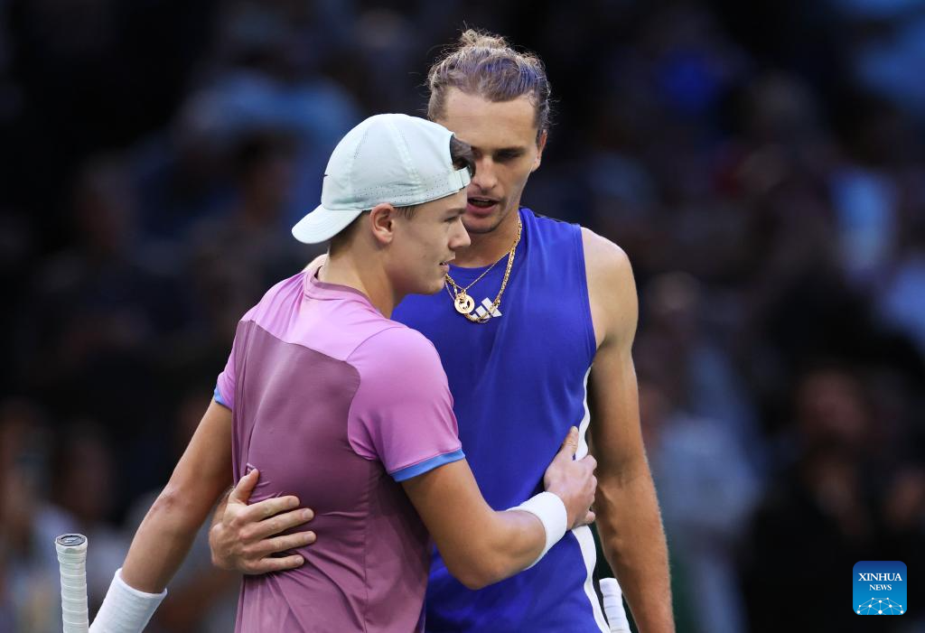 Alexander Zverev (R) of Germany and Holger Rune of Denmark hug after their men's singles semi-final match at Paris ATP Masters 1000 tennis tournament in Paris, France, Nov. 2, 2024. (Xinhua/Gao Jing)