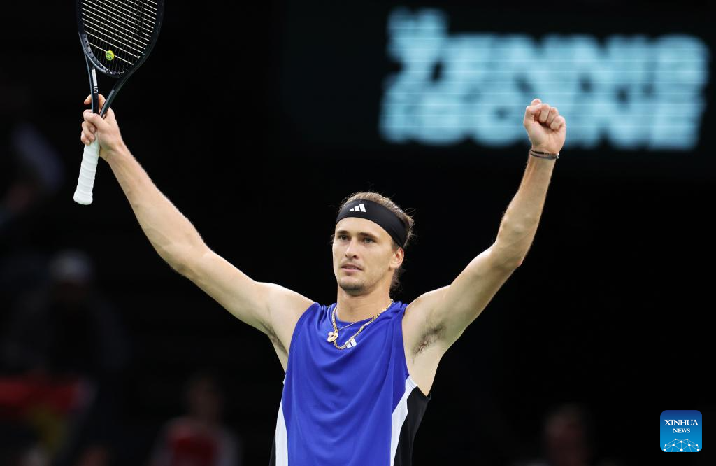 Alexander Zverev of Germany celebrates his victory after the men's singles semi-final match between Alexander Zverev of Germany and Holger Rune of Denmark at Paris ATP Masters 1000 tennis tournament in Paris, France, Nov. 2, 2024. (Xinhua/Gao Jing)