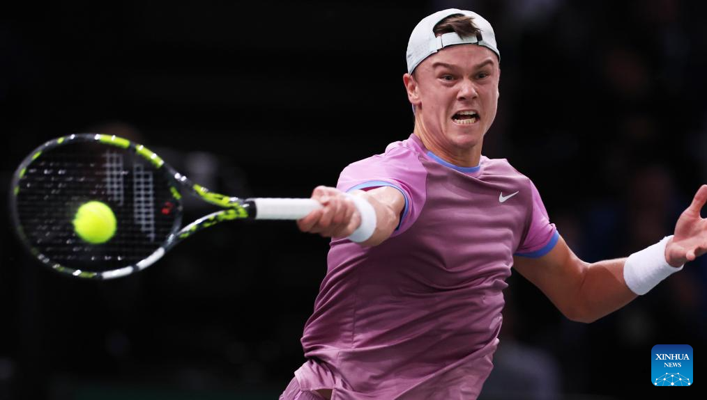 Holger Rune of Denmark hits a return during the men's singles semi-final match between Alexander Zverev of Germany and Holger Rune of Denmark at Paris ATP Masters 1000 tennis tournament in Paris, France, Nov. 2, 2024. (Xinhua/Gao Jing)