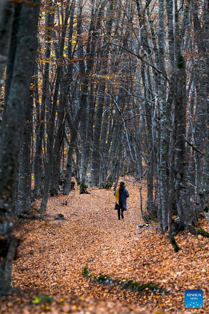 A woman walks in a forest area at Mavrovo National Park in Mavrovo, North Macedonia, Nov. 3, 2024. (Photo by Tomislav Georgiev/Xinhua)