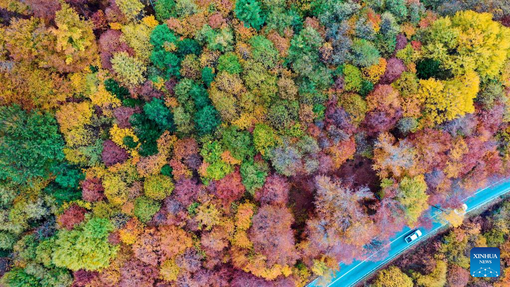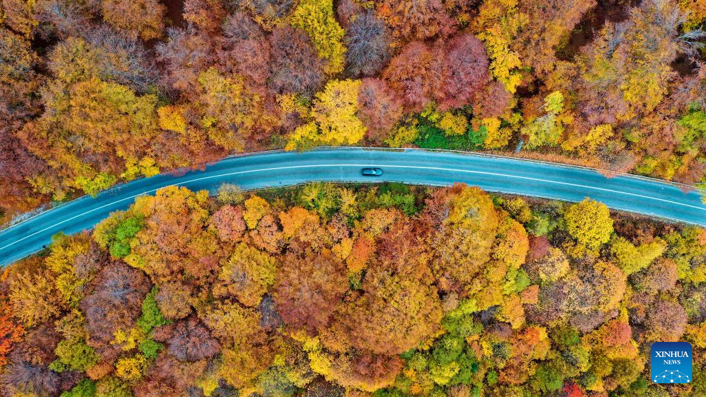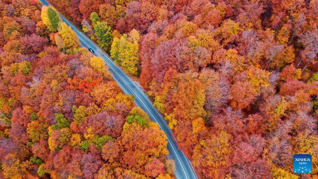 An aerial drone photo shows a car running on a road at Mavrovo National Park in Mavrovo, North Macedonia, Nov. 3, 2024. (Photo by Tomislav Georgiev/Xinhua)