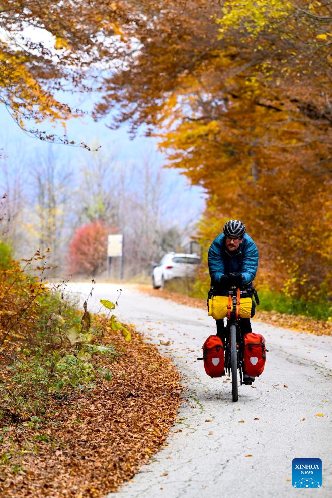A man rides a bike at Mavrovo National Park in Mavrovo, North Macedonia, Nov. 3, 2024. (Photo by Tomislav Georgiev/Xinhua)