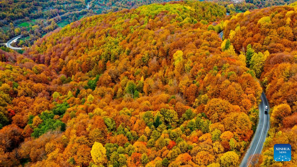 An aerial drone photo shows cars running on a road at Mavrovo National Park in Mavrovo, North Macedonia, Nov. 3, 2024. (Photo by Tomislav Georgiev/Xinhua)