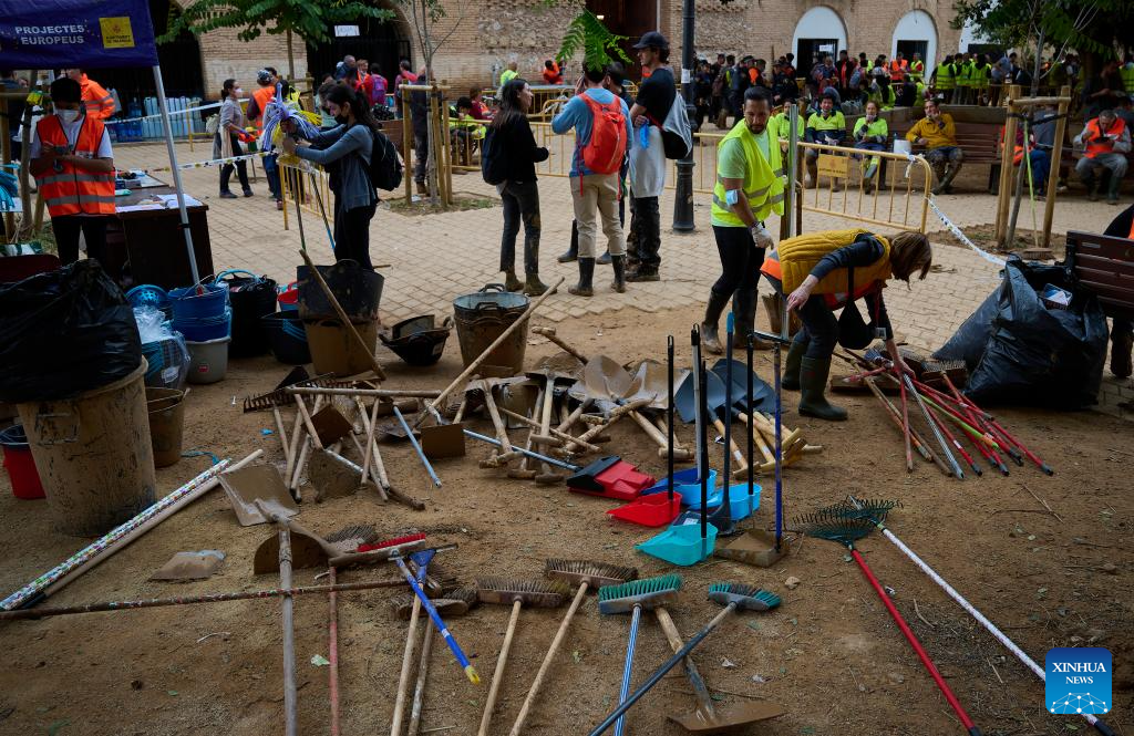 Volunteers distribute tools in Valencia, Spain, Nov. 3, 2024.