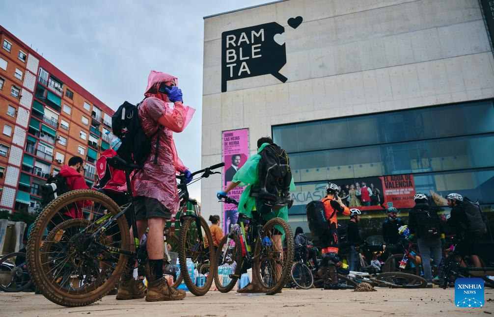 Volunteers prepare to deliver relief supplies via biking in Valencia, Spain, Nov. 3, 2024.