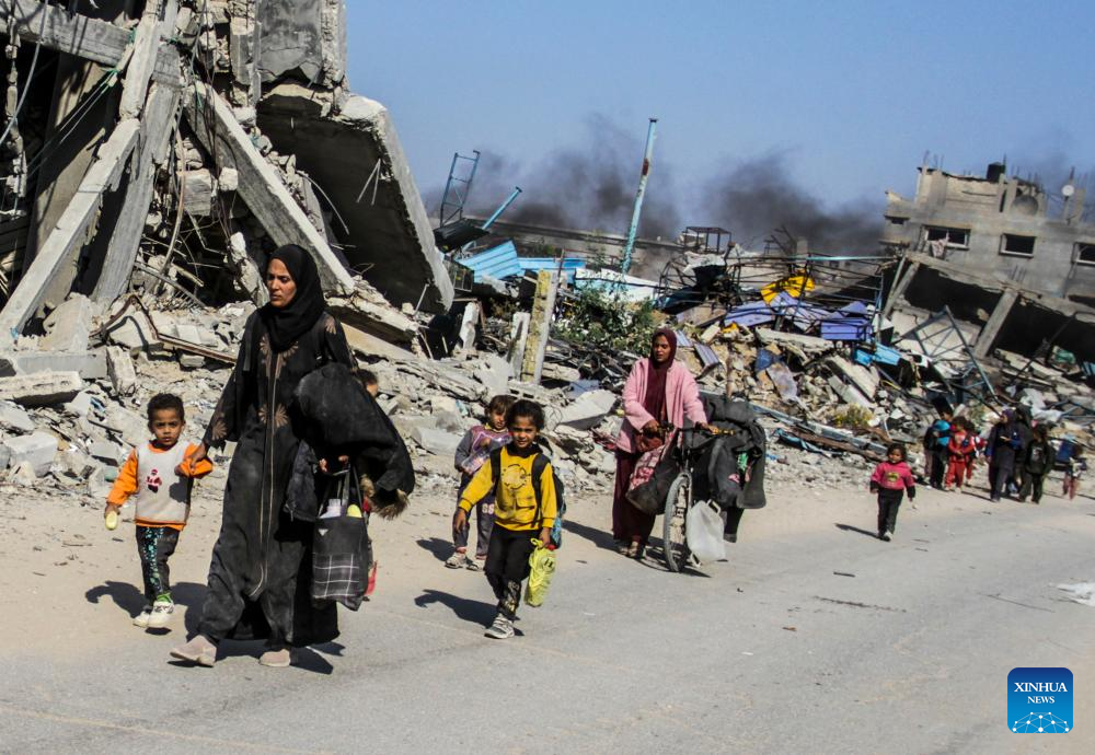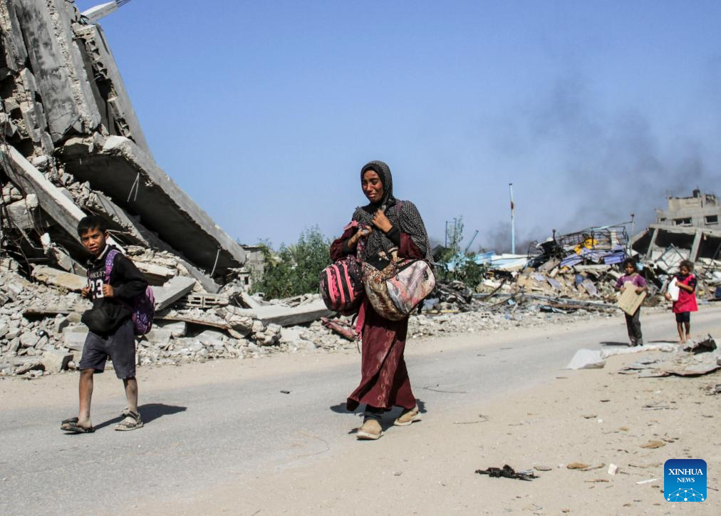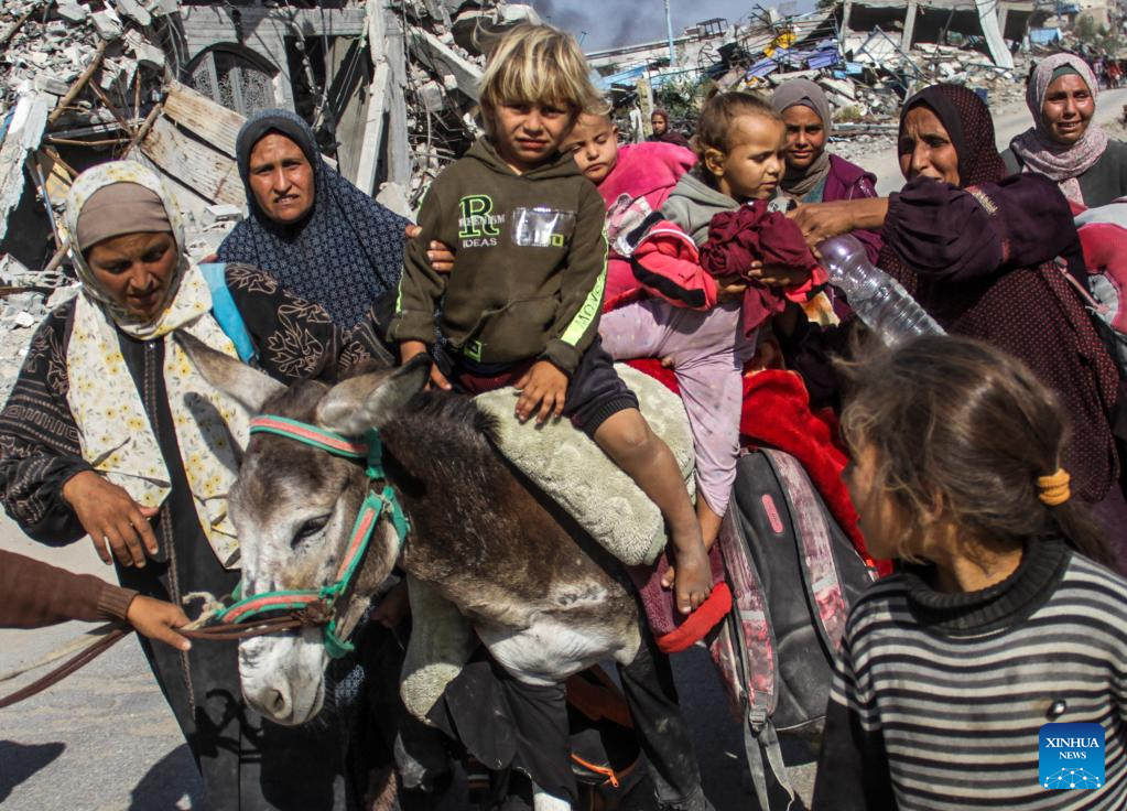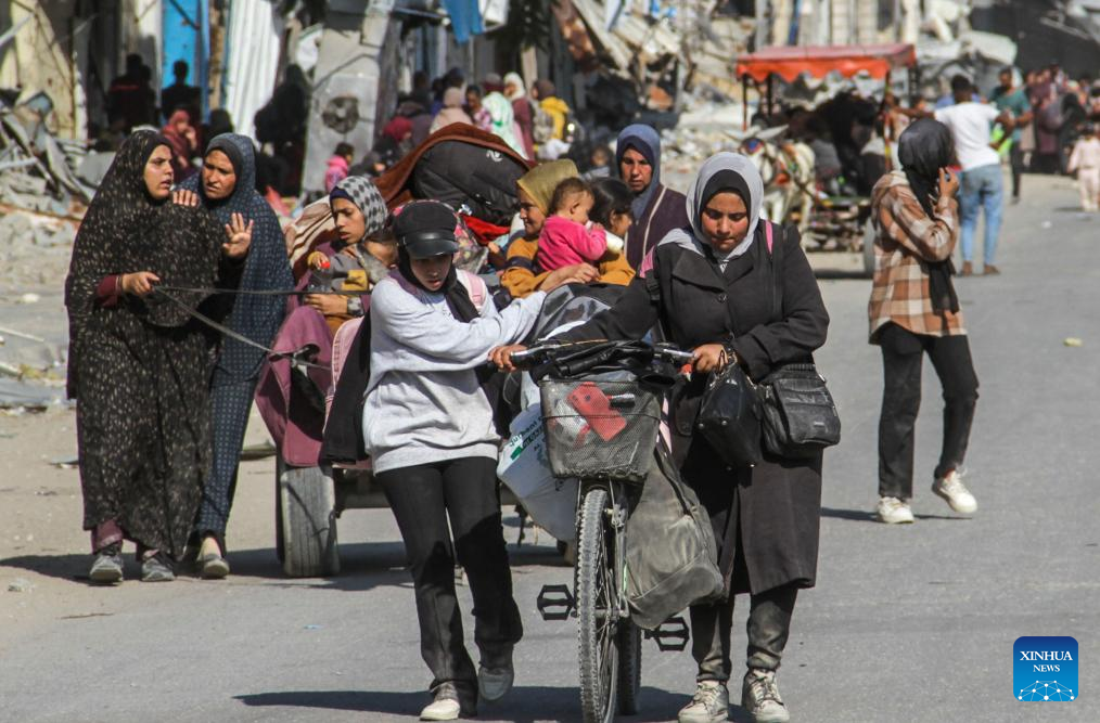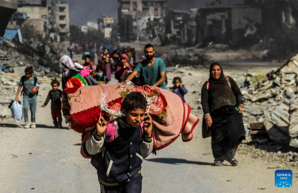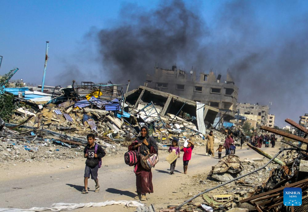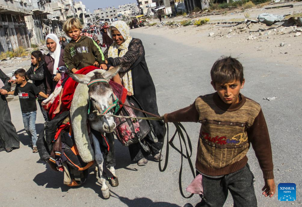 People forced to flee from Beit Lahia are seen in Gaza City, on Nov. 5, 2024. At least 25 Palestinians were killed by Israeli bombing of a house in the town of Beit Lahia in the northern Gaza Strip, the Palestinian official news agency WAFA reported on Tuesday. (Photo by Mahmoud Zaki/Xinhua)