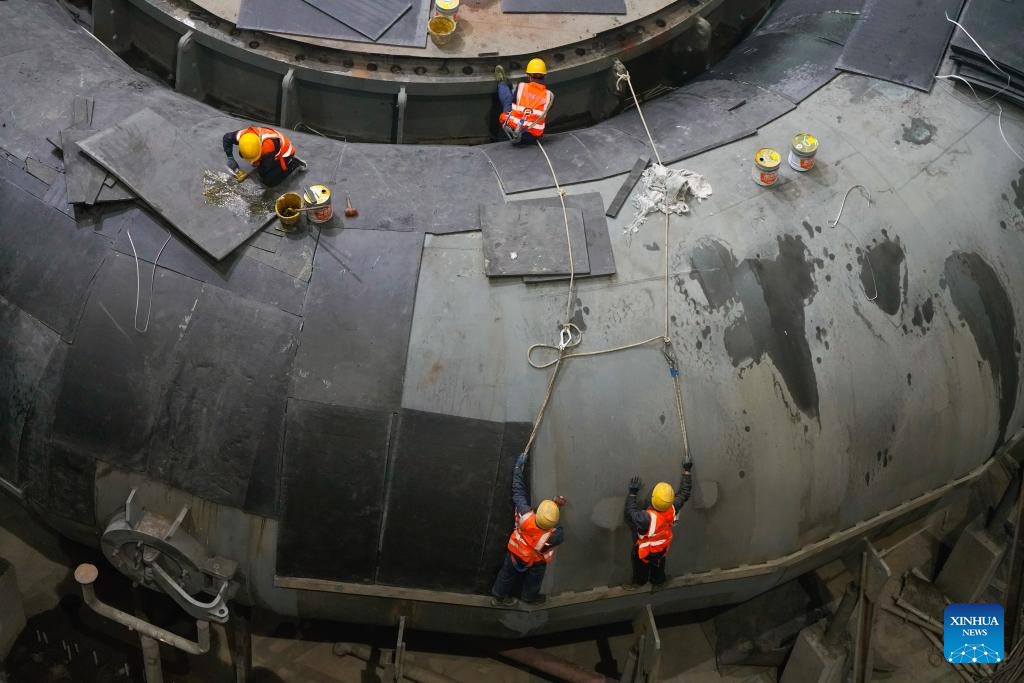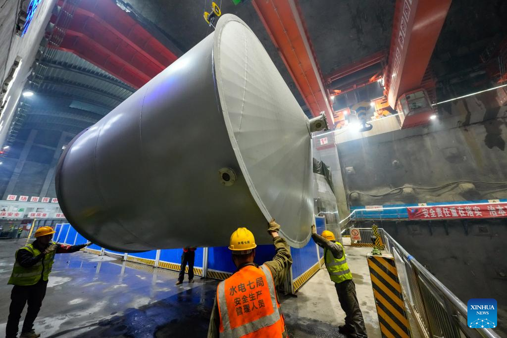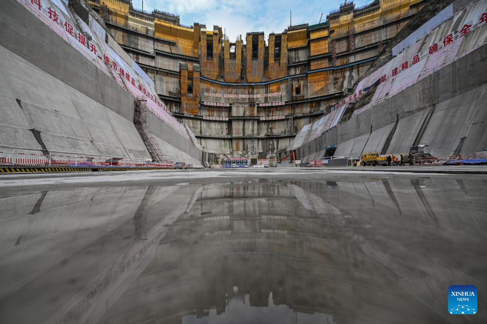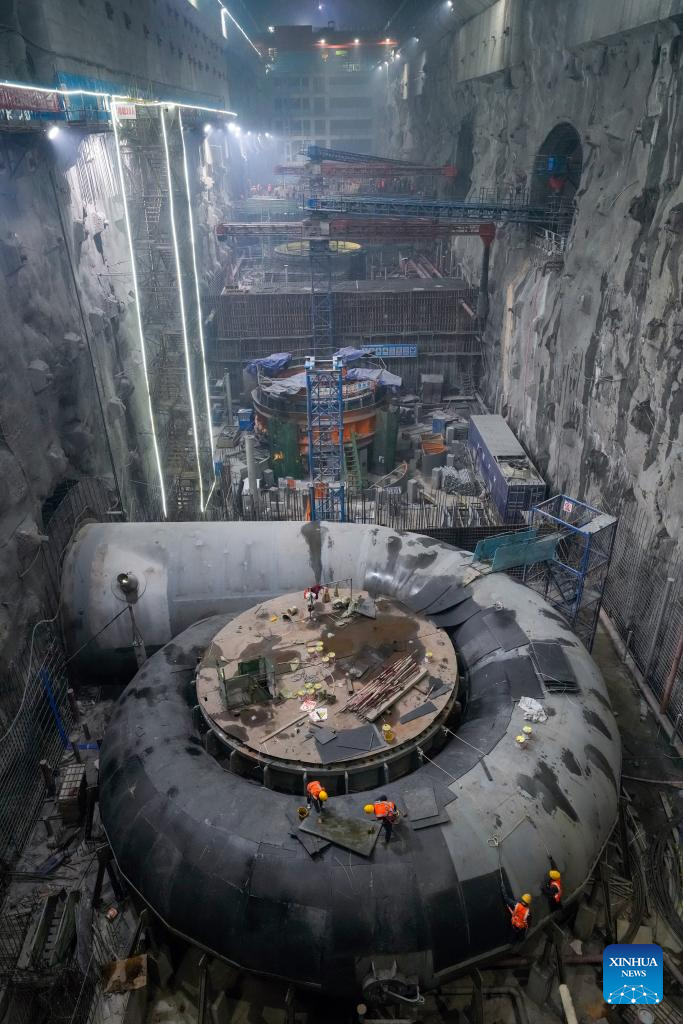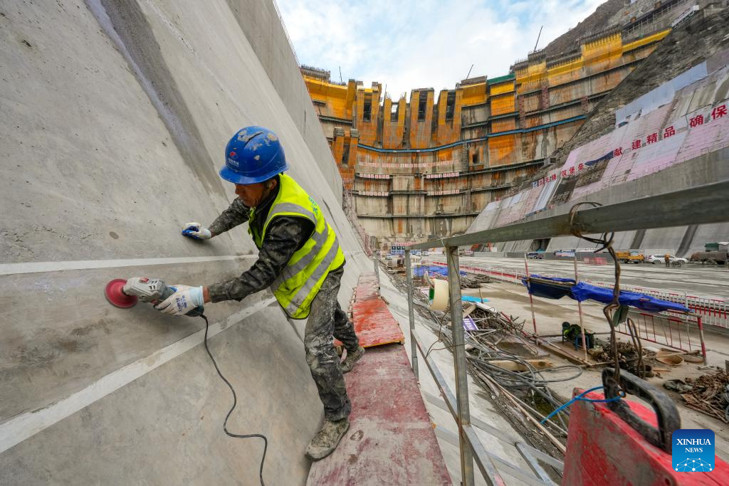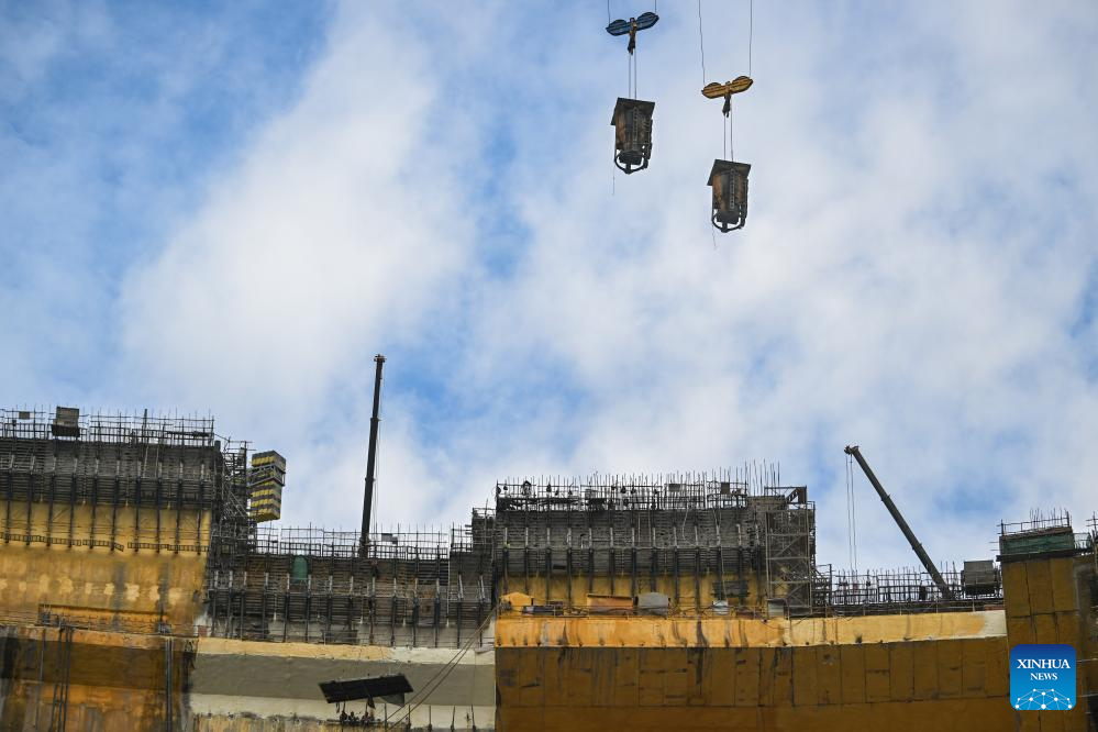 Workers operate at the construction site of Yebatan Hydropower Station in southwest China, Nov. 5, 2024. The Yebatan Hydropower Station is located at the junction of Baiyu County in southwest China's Sichuan Province and Konjo County in Xizang Autonomous Region.