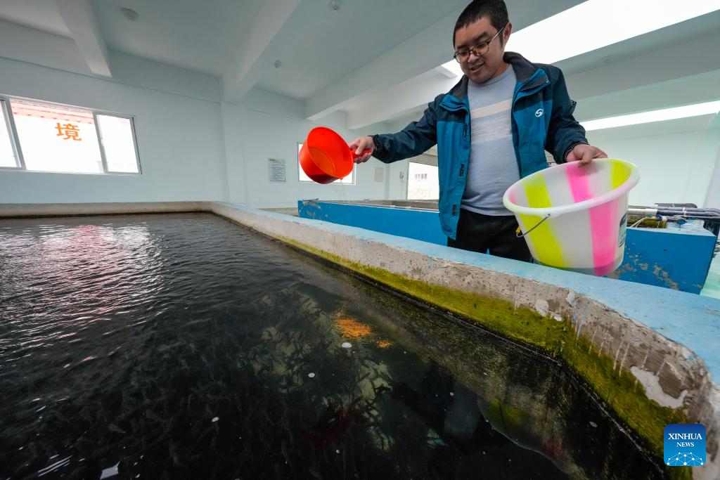 A staff member feeds fish at a fish breeding and releasing station of Yebatan Hydropower Station in southwest China, Nov. 5, 2024. The Yebatan Hydropower Station is located at the junction of Baiyu County in southwest China's Sichuan Province and Konjo County in Xizang Autonomous Region.