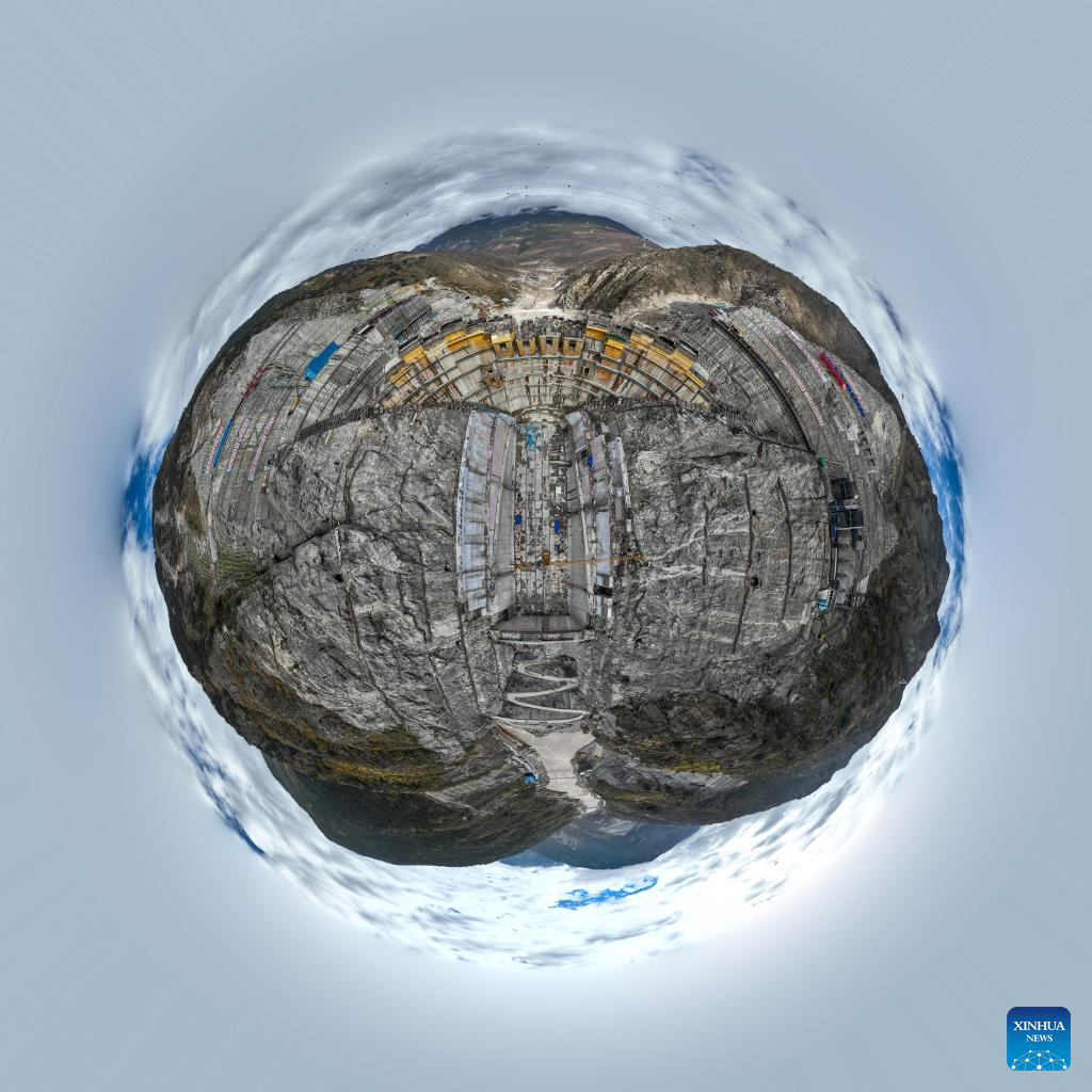 An aerial panoramic drone photo taken on Nov. 5, 2024 shows the construction site of Yebatan Hydropower Station in southwest China. The Yebatan Hydropower Station is located at the junction of Baiyu County in southwest China's Sichuan Province and Konjo County in Xizang Autonomous Region.