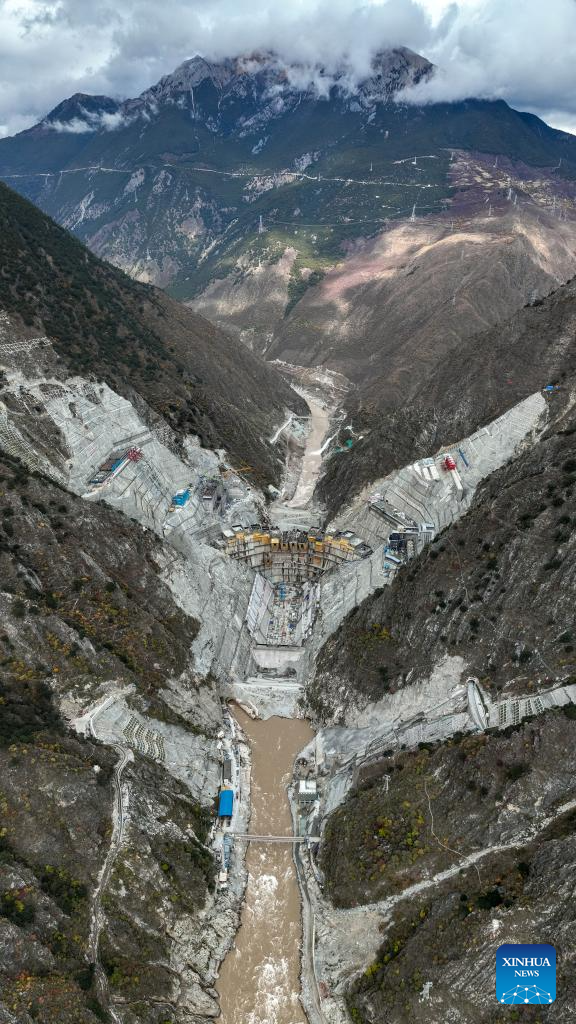 An aerial drone photo taken on Nov. 5, 2024 shows the construction site of Yebatan Hydropower Station in southwest China. The Yebatan Hydropower Station is located at the junction of Baiyu County in southwest China's Sichuan Province and Konjo County in Xizang Autonomous Region.