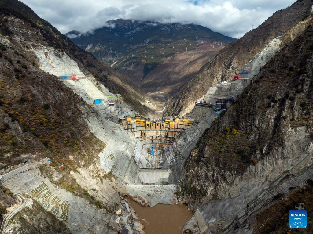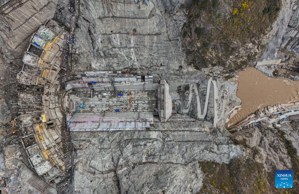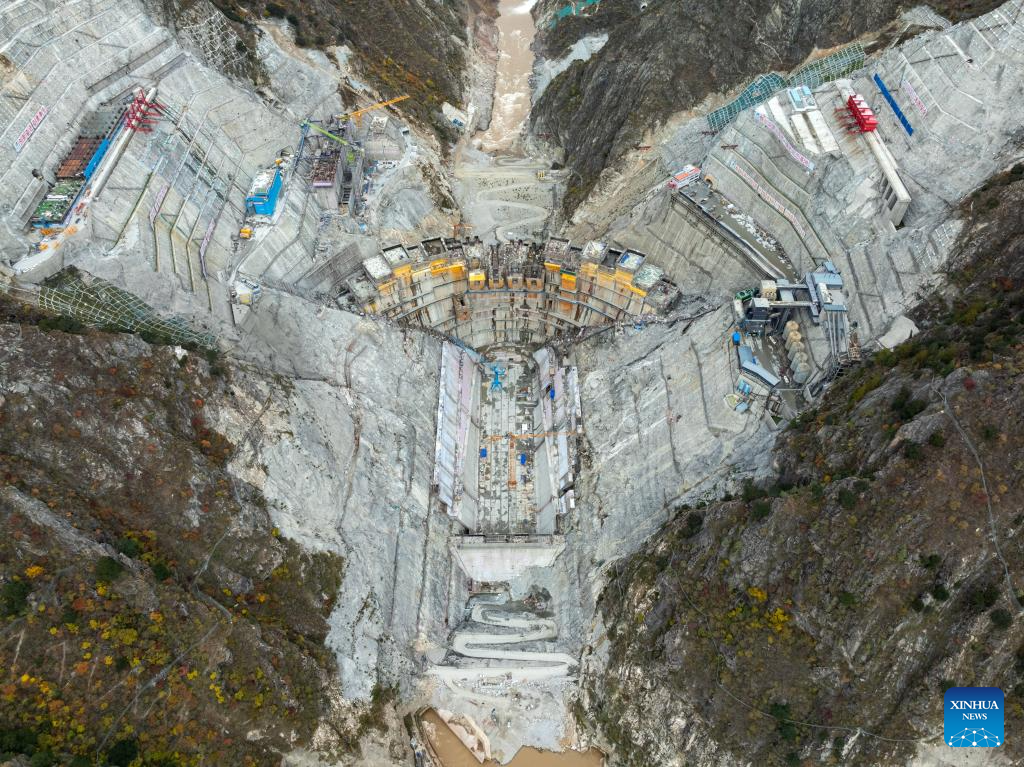 This photo taken on Nov. 5, 2024 shows the construction site of Yebatan Hydropower Station in southwest China. The Yebatan Hydropower Station is located at the junction of Baiyu County in southwest China's Sichuan Province and Konjo County in Xizang Autonomous Region.