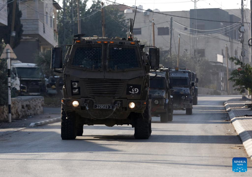 Israeli military vehicles are seen during an Israeli raid in Jenin, northern West Bank, on Nov. 5, 2024. Four Palestinians were killed in Israeli airstrikes and gunfire in Jenin and Tubas, the Palestinian Health Ministry said Tuesday. (Photo by Nidal Eshtayeh/Xinhua)